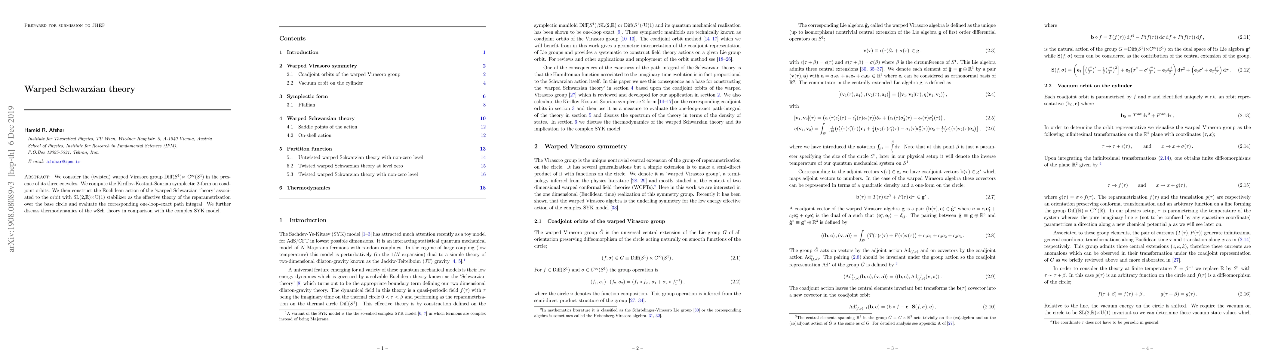 This paper explores the warped Virasoro group and its cocycles, computing the symplectic 2-form on coadjoint orbits and constructing the Euclidean action for the warped Schwarzian theory. It evaluates the one-loop-exact path integral and compares the thermodynamics of this theory with the complex SYK model.