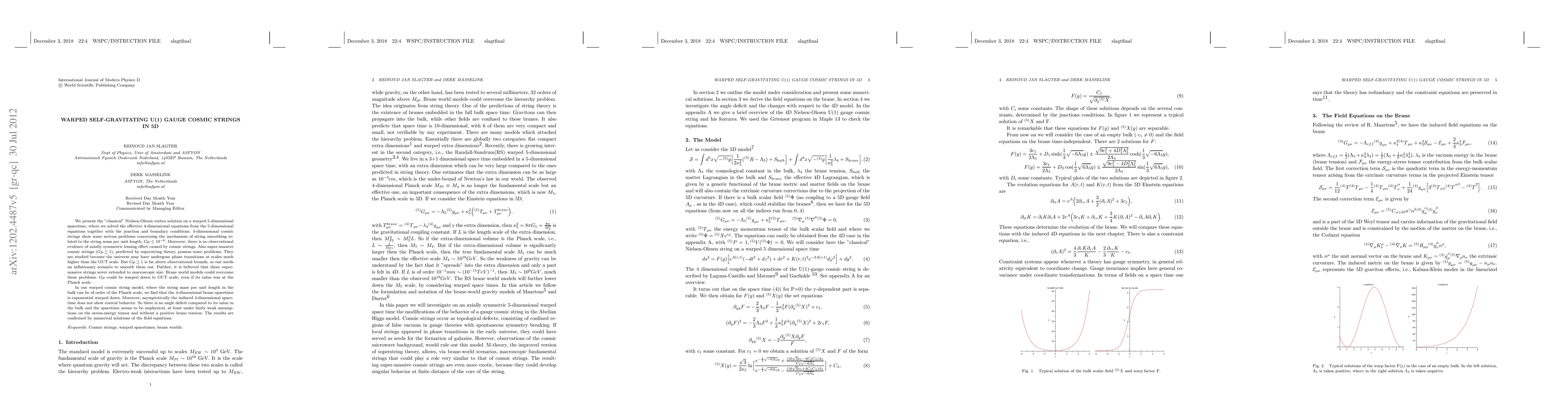 This paper explores the classical Nielsen-Olesen vortex solution for cosmic strings in a warped five-dimensional spacetime, demonstrating that the effective four-dimensional equations can warp the string mass per unit length down to the GUT scale, potentially resolving issues with super-massive cosmic strings predicted by superstring theory. Numerical solutions confirm that the induced four-dimensional spacetime does not exhibit conical behavior, suggesting a more physically viable model.