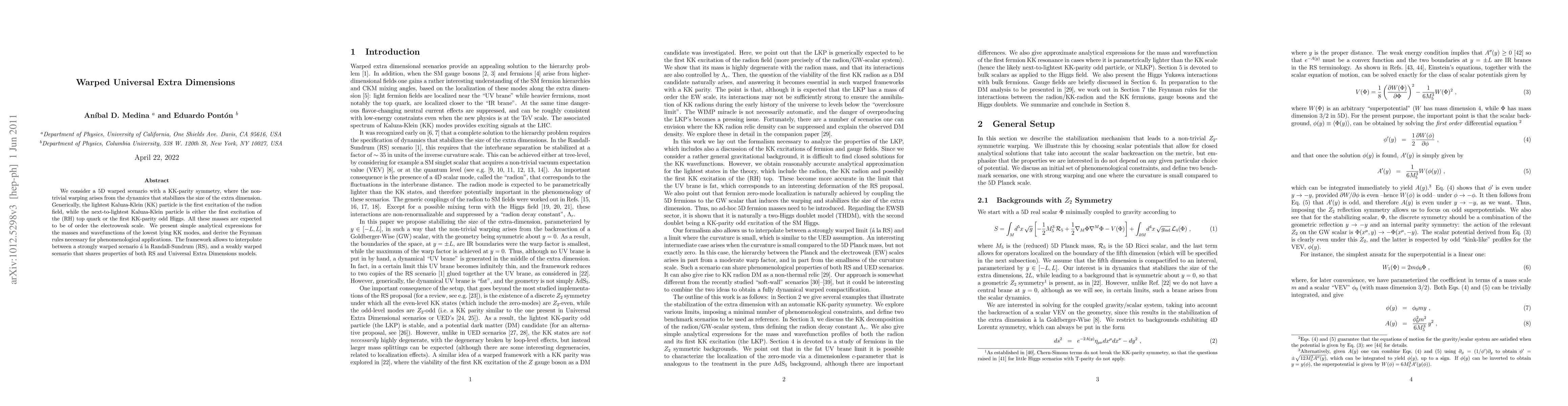 We consider a 5D warped scenario with a KK-parity symmetry, where the non-trivial warping arises from the dynamics that stabilizes the size of the extra dimension. Generically, the lightest Kaluza-Klein (KK) particle is the first excitation of the radion field, while the next-to-lightest Kaluza-Klein particle is either the first excitation of the (RH) top quark or the first KK-parity odd Higgs. All these masses are expected to be of order the electroweak scale. We present simple analytical expressions for the masses and wavefunctions of the lowest lying KK modes, and derive the Feynman rules necessary for phenomenological applications. The framework allows to interpolate between a strongly warped scenario a la Randall-Sundrum (RS), and a weakly warped scenario that shares properties of both RS and Universal Extra Dimensions models.