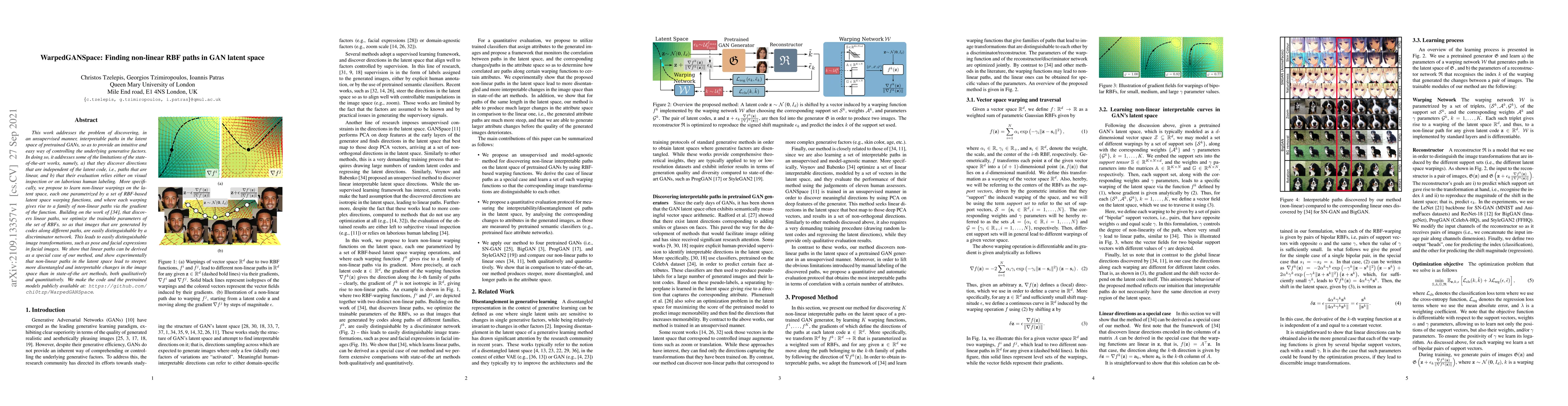 This work addresses the problem of discovering, in an unsupervised manner, interpretable paths in the latent space of pretrained GANs, so as to provide an intuitive and easy way of controlling the underlying generative factors. In doing so, it addresses some of the limitations of the state-of-the-art works, namely, a) that they discover directions that are independent of the latent code, i.e., paths that are linear, and b) that their evaluation relies either on visual inspection or on laborious human labeling. More specifically, we propose to learn non-linear warpings on the latent space, each one parametrized by a set of RBF-based latent space warping functions, and where each warping gives rise to a family of non-linear paths via the gradient of the function. Building on the work of Voynov and Babenko, that discovers linear paths, we optimize the trainable parameters of the set of RBFs, so as that images that are generated by codes along different paths, are easily distinguishable by a discriminator network. This leads to easily distinguishable image transformations, such as pose and facial expressions in facial images. We show that linear paths can be derived as a special case of our method, and show experimentally that non-linear paths in the latent space lead to steeper, more disentangled and interpretable changes in the image space than in state-of-the art methods, both qualitatively and quantitatively. We make the code and the pretrained models publicly available at: https://github.com/chi0tzp/WarpedGANSpace.