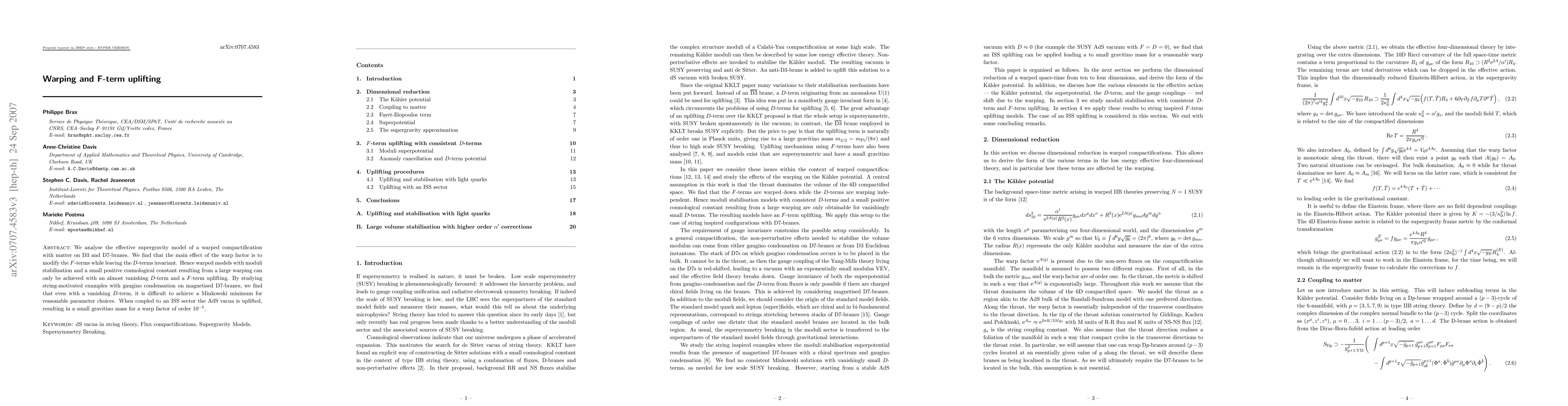 Researchers study warped compactification models with matter on D3 and D7-branes, finding that warp factors modify F-terms while leaving D-term invariant; they also find it challenging to achieve a Minkowski minimum without F-term uplifting.