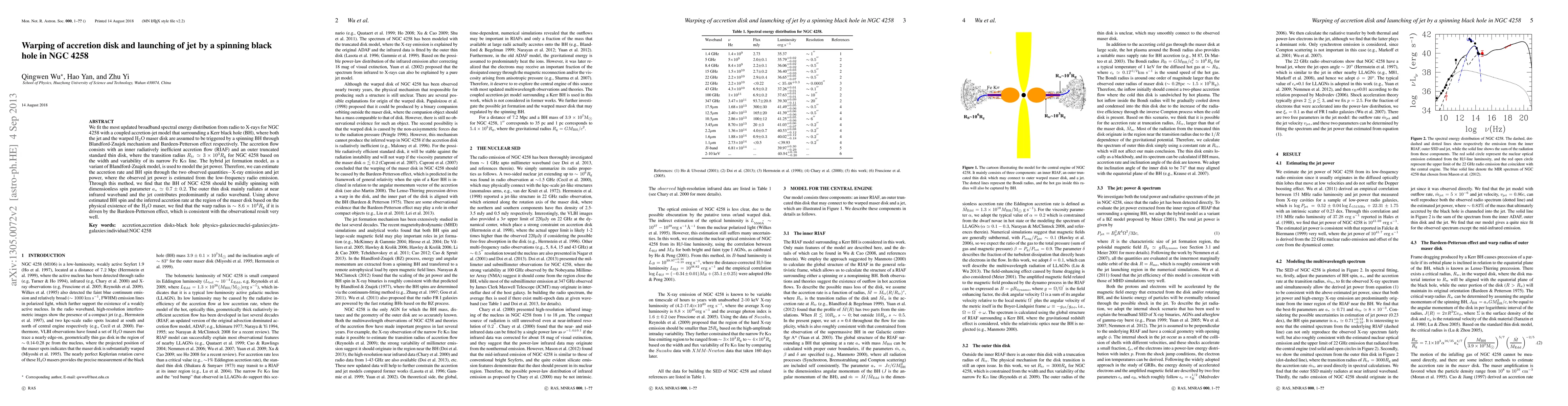 We fit the most updated broadband spectral energy distribution from radio to X-rays for NGC 4258 with a coupled accretion-jet model that surrounding a Kerr black hole (BH), where both the jet and the warped H_2O maser disk are assumed to be triggered by a spinning BH through Blandford-Znajek mechanism and Bardeen-Petterson effect respectively. The accretion flow consists with an inner radiatively inefficient accretion flow (RIAF) and an outer truncated standard thin disk, where the transition radius R_tr~3*10^3Rg for NGC 4258 based on the width and variability of its narrow Fe K$\alpha$ line. The hybrid jet formation model, as a variant of Blandford-Znajek model, is used to model the jet power. Therefore, we can estimate the accretion rate and BH spin through the two observed quantities--X-ray emission and jet power, where the observed jet power is estimated from the low-frequency radio emission. Through this method, we find that the BH of NGC 4258 should be mildly spinning with dimensionless spin parameter a_*=0.7\pm0.2. The outer thin disk mainly radiates at near infrared waveband and the jet contributes predominantly at radio waveband. Using above estimated BH spin and the inferred accretion rate at the region of the maser disk based on the physical existence of the H_2 O maser, we find that the warp radius is ~8.6*10^4 R_g if it is driven by the Bardeen-Petterson effect, which is consistent with the observational result very well.