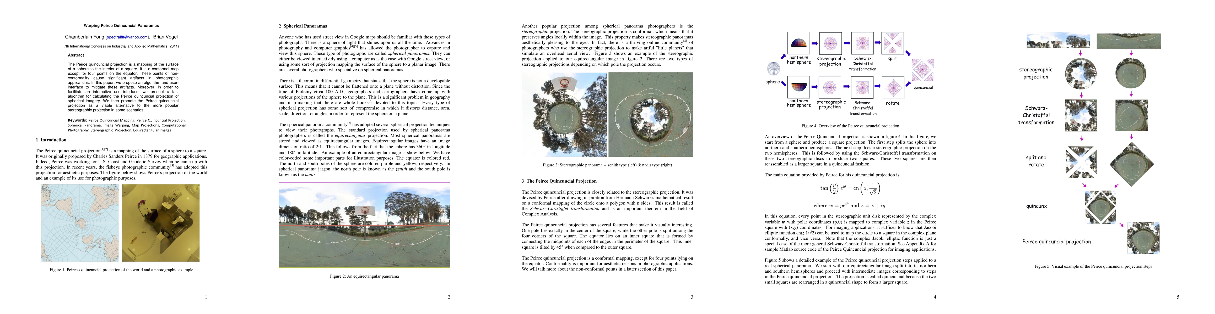 The Peirce quincuncial projection is a mapping of the surface of a sphere to the interior of a square. It is a conformal map except for four points on the equator. These points of non-conformality cause significant artifacts in photographic applications. In this paper, we propose an algorithm and user-interface to mitigate these artifacts. Moreover, in order to facilitate an interactive user-interface, we present a fast algorithm for calculating the Peirce quincuncial projection of spherical imagery. We then promote the Peirce quincuncial projection as a viable alternative to the more popular stereographic projection in some scenarios.