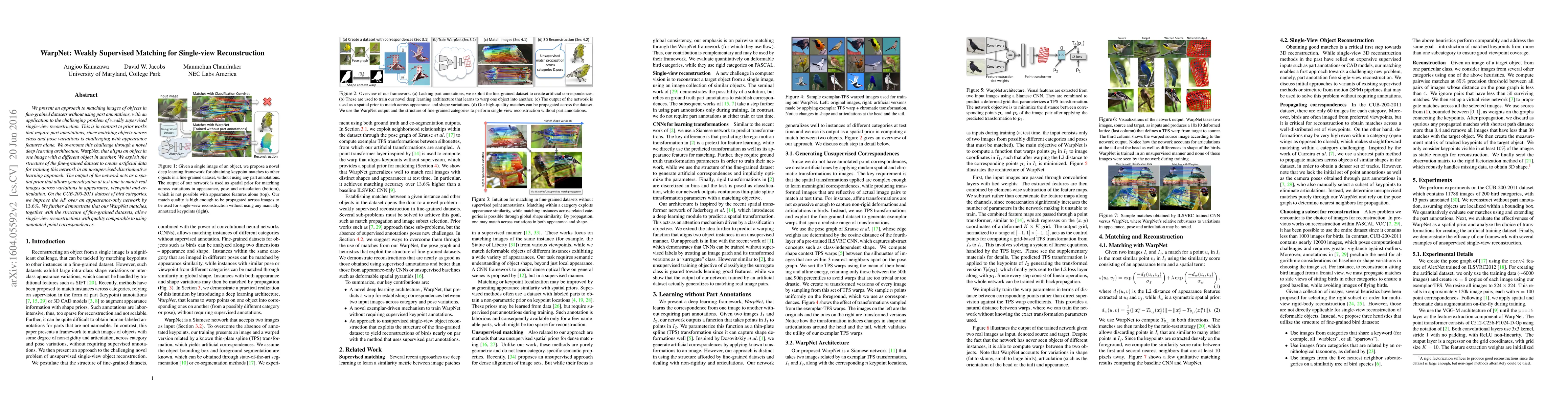 This research introduces WarpNet, a deep learning architecture for weakly supervised matching of images in fine-grained datasets, without part annotations. It achieves this through unsupervised-discriminative learning, using the dataset's structure to generate artificial training data. The method outperforms appearance-only networks by 13.6% on the CUB-200-2011 bird dataset and enables single-view reconstructions comparable to those using annotated point correspondences.