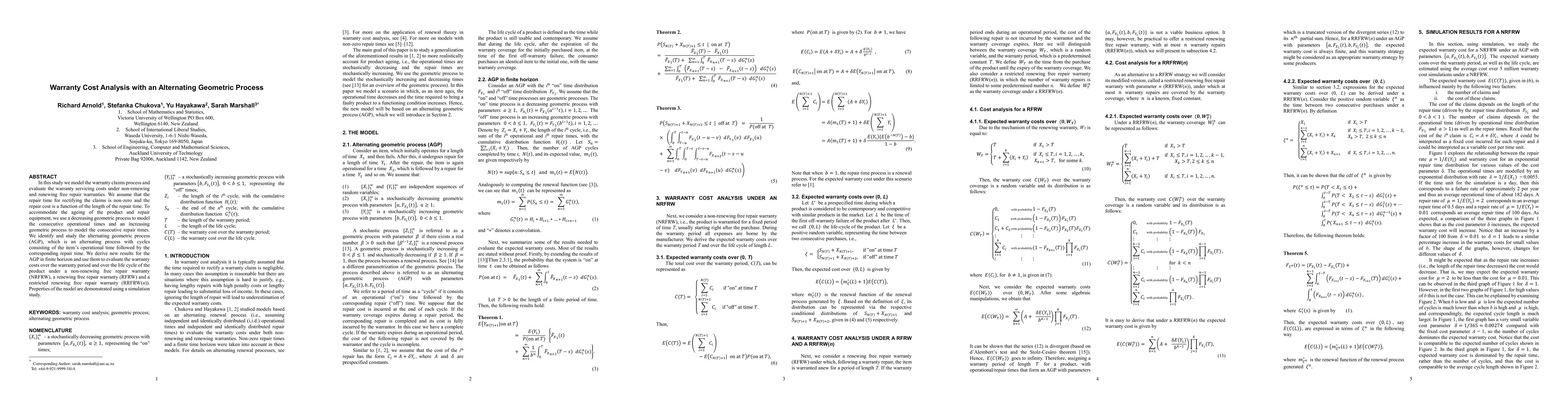 In this study we model the warranty claims process and evaluate the warranty servicing costs under non-renewing and renewing free repair warranties. We assume that the repair time for rectifying the claims is non-zero and the repair cost is a function of the length of the repair time. To accommodate the ageing of the product and repair equipment, we use a decreasing geometric process to model the consecutive operational times and an increasing geometric process to model the consecutive repair times. We identify and study the alternating geometric process (AGP), which is an alternating process with cycles consisting of the item's operational time followed by the corresponding repair time. We derive new results for the AGP in finite horizon and use them to evaluate the warranty costs over the warranty period and over the life cycle of the product under a non-renewing free repair warranty (NRFRW), a renewing free repair warranty (RFRW) and a restricted renewing free repair warranty (RRFRW(n)). Properties of the model are demonstrated using a simulation study.