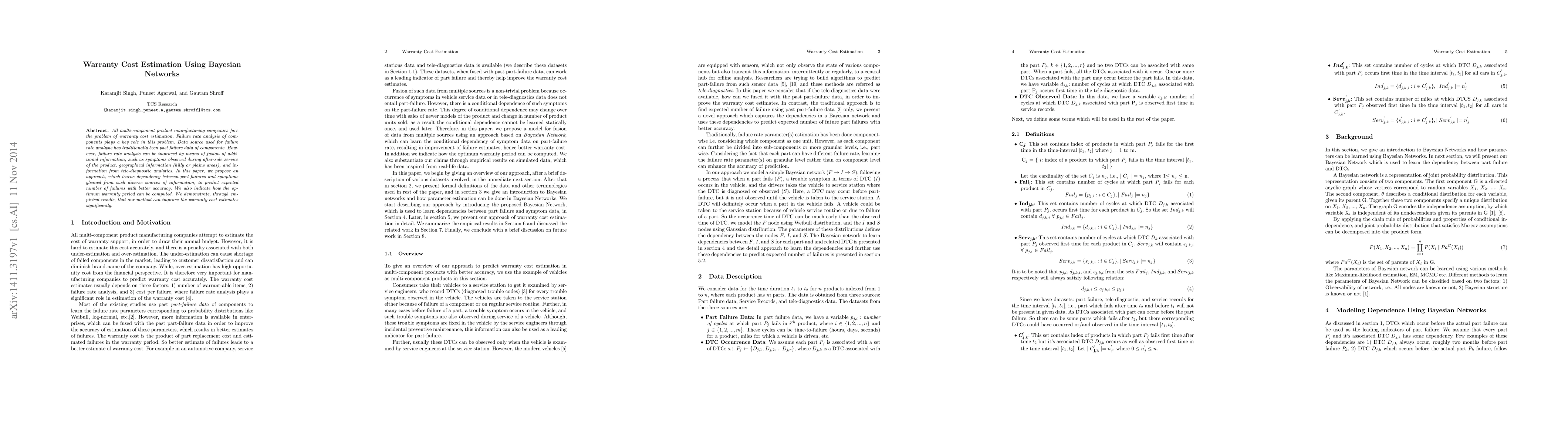 All multi-component product manufacturing companies face the problem of warranty cost estimation. Failure rate analysis of components plays a key role in this problem. Data source used for failure rate analysis has traditionally been past failure data of components. However, failure rate analysis can be improved by means of fusion of additional information, such as symptoms observed during after-sale service of the product, geographical information (hilly or plains areas), and information from tele-diagnostic analytics. In this paper, we propose an approach, which learns dependency between part-failures and symptoms gleaned from such diverse sources of information, to predict expected number of failures with better accuracy. We also indicate how the optimum warranty period can be computed. We demonstrate, through empirical results, that our method can improve the warranty cost estimates significantly.