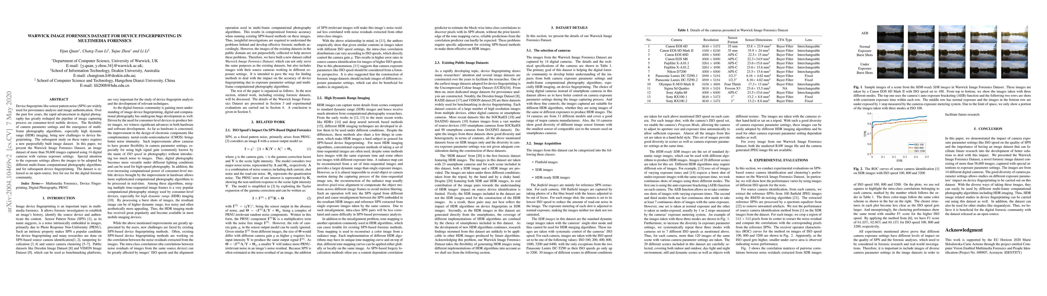 A new image dataset of over 58,600 images is introduced for device fingerprinting in multimedia forensics, capturing various exposure settings and computational photography algorithms. The dataset can be used to support research on the challenges and limitations of device fingerprinting.