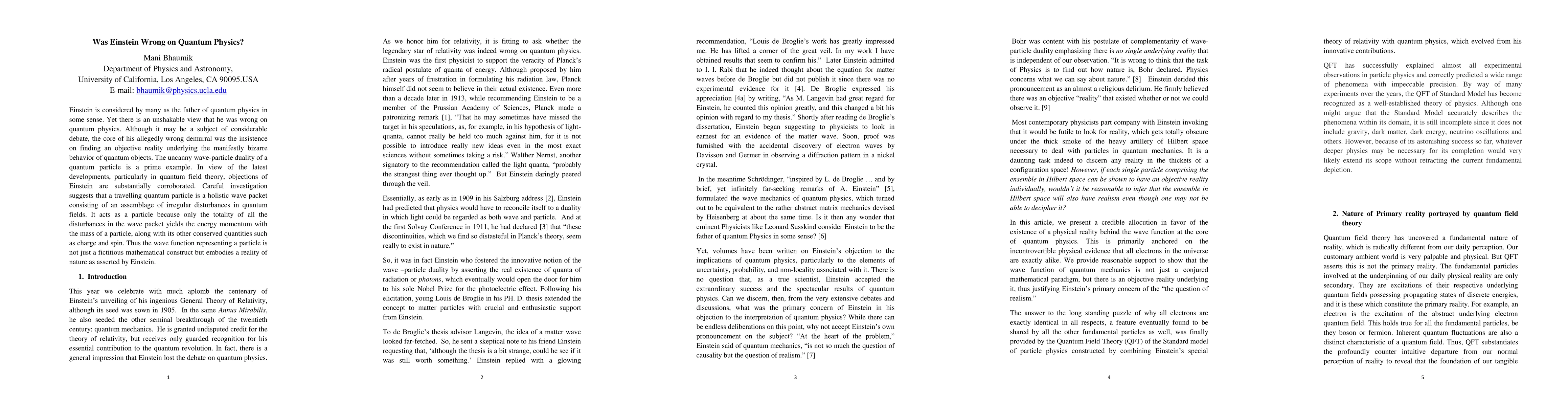 The paper argues that recent developments in quantum field theory support Einstein's insistence on an objective reality underlying quantum behavior. It suggests that a quantum particle is a wave packet of field disturbances, validating Einstein's view that wave functions represent real aspects of nature, contrary to the traditional interpretation that they are mere mathematical tools.