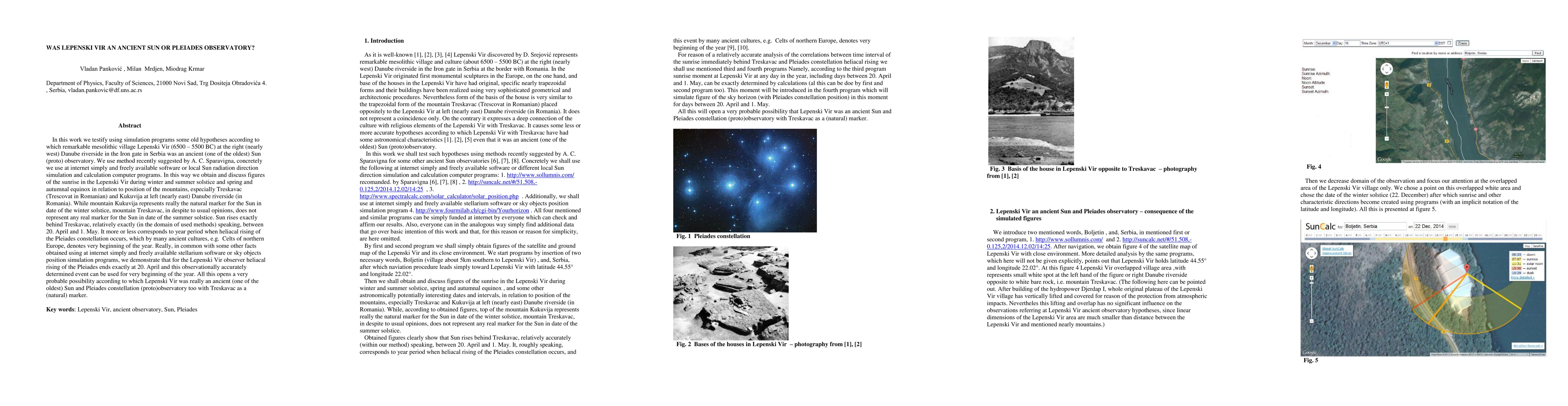 In this work we consider some old hypotheses according to which remarkable mesolithic village Lepenski Vir (9500 -- 5500 BC) at the right (nearly west) Danube riverside in the Iron gate in Serbia was an ancient (one of the oldest) Sun observatory. We use method recently suggested by A. C. Sparavigna, concretely we use "freely available software" or local Sun radiation direction simulation computer programs. In this way we obtain and discuss pictures of the sunrise in the Lepenski Vir during winter and summer solstice and spring and autumn equinox in relation to position of the mountains, especially Treskavac (Trescovat) and Kukuvija at left (nearly east) Danube riverside (in Romania). While mountain Kukuvija represents really the marker for the Sun in date of the winter solstice, mountain Treskavac, in despite to usual opinions, does not represent a real marker for the Sun in date of the summer solstice. Sun rises behind Treskavac, roughly speaking, between 22.April and 1. May. It corresponds to year period when heliacal rising of the Pleiades constellation occurs, which by many ancient cultures, e.g. Celts of northern Europe, denotes very beginning of the year. All this, in common with some archeological facts (house-shrine No.47 in the Lepenski Vir holds seven signs beside hearth which would correspond to the seven Pleiades stars), opens a possibility that Lepenski Vir was an ancient Pleiades constellation observatory.