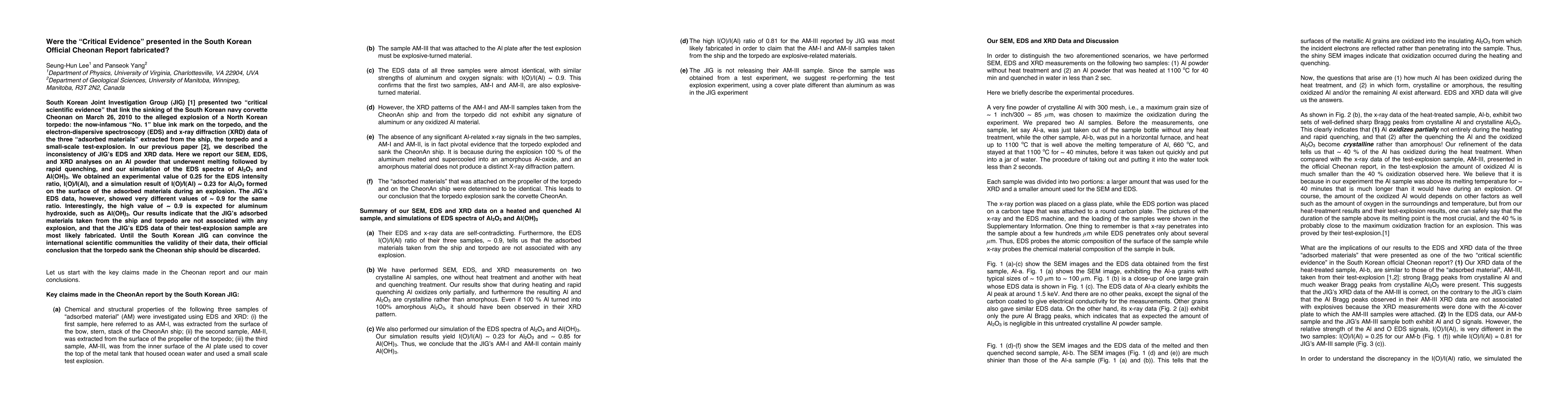 This paper questions the validity of the South Korean Joint Investigation Group's (JIG) "critical scientific evidence" linking the Cheonan sinking to a North Korean torpedo, finding significant discrepancies in their electron-dispersive spectroscopy data compared to controlled experiments and simulations. The authors suggest the evidence may be fabricated.