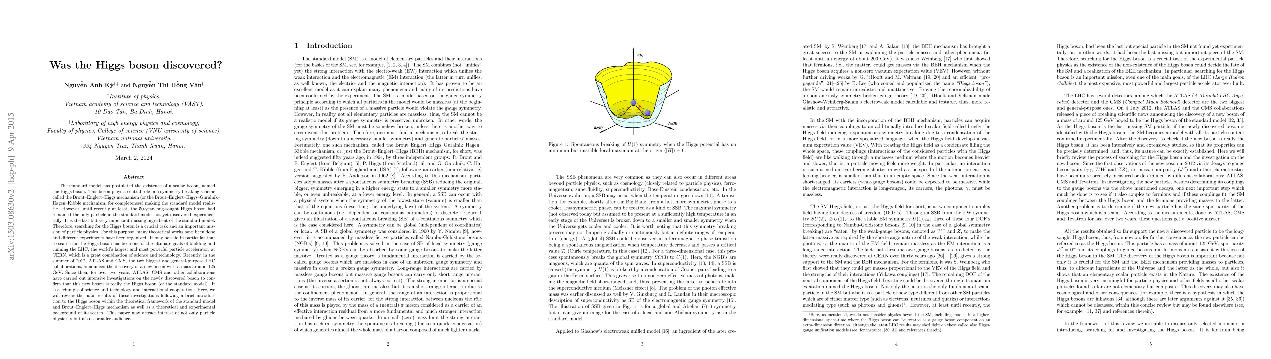 The standard model has postulated the existence of a scalar boson, named the Higgs boson. This boson plays a central role in a symmetry breaking scheme called the Brout-Englert-Higgs mechanism (or the Brout-Englert-Higgs-Guralnik-Hagen-Kibble mechanism, for completeness) making the standard model realistic. However, until recently at least, the 50-year-long-sought Higgs boson had remained the only particle in the standard model not yet discovered experimentally. It is the last but very important missing ingredient of the standard model. Therefore, searching for the Higgs boson is a crucial task and an important mission of particle physics. For this purpose, many theoretical works have been done and different experiments have been organized. It may be said in particular that to search for the Higgs boson has been one of the ultimate goals of building and running the LHC, the world's largest and most powerful particle accelerator, at CERN, which is a great combination of science and technology. Recently, in the summer of 2012, ATLAS and CMS, the two biggest and general-purpose LHC collaborations, announced the discovery of a new boson with a mass around 125 GeV. Since then, for over two years, ATLAS, CMS and other collaborations have carried out intensive investigations on the newly discovered boson to confirm that this new boson is really the Higgs boson (of the standard model). It is a triumph of science and technology and international cooperation. Here, we will review the main results of these investigations following a brief introduction to the Higgs boson within the theoretical framework of the standard model and Brout-Englert-Higgs mechanism as well as a theoretical and experimental background of its search. This paper may attract interest of not only particle physicists but also a broader audience.