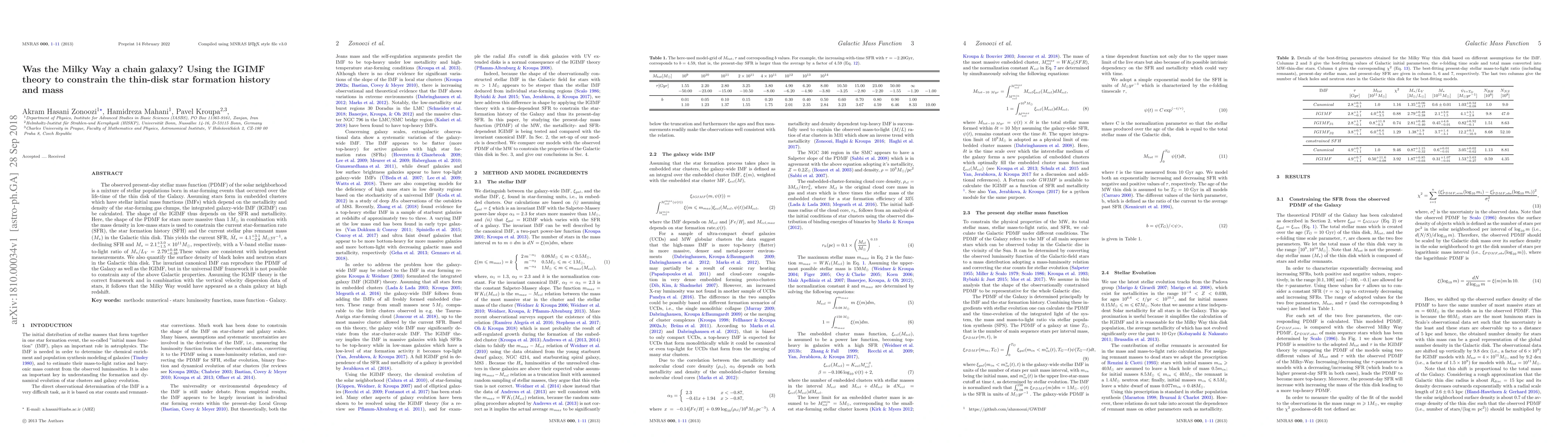This paper uses the IGIMF theory to analyze the star formation history and mass of the Milky Way's thin disk, finding a declining star formation rate and a total stellar mass of $2.1 \times 10^{11} M_\odot$. It concludes that the Milky Way likely appeared as a chain galaxy at high redshift based on IGIMF theory and vertical velocity dispersion data.
