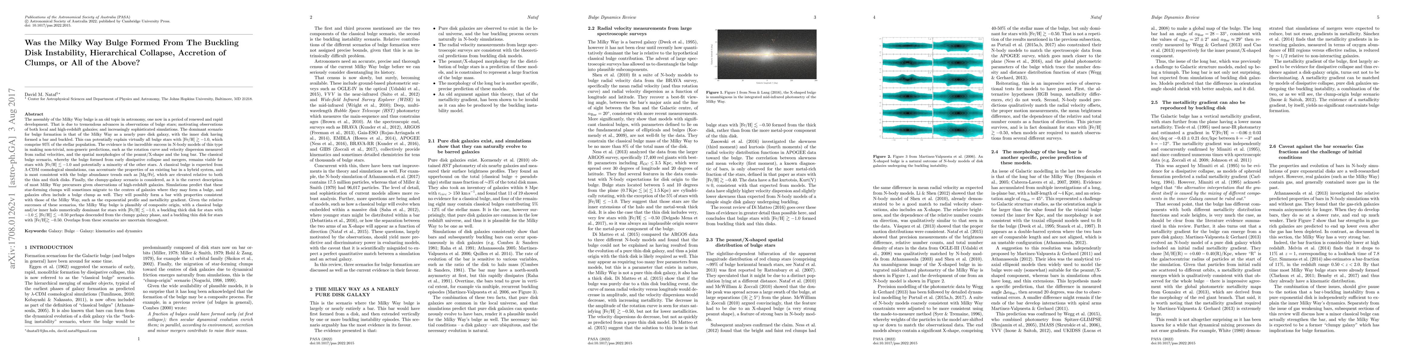 The Milky Way bulge likely formed from a combination of mechanisms including the buckling of the inner disk, hierarchical collapse, and accretion of star-forming clumps, with different processes dominating for stars of varying metallicity. This composite origin is supported by N-body models, cosmological simulations, and observations of high-redshift galaxies.