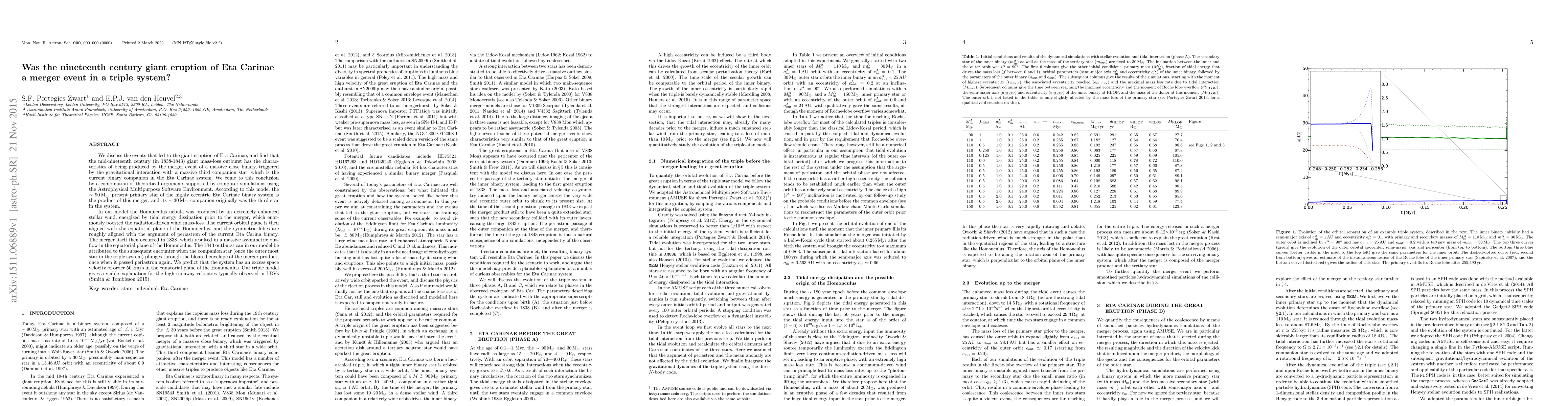 The nineteenth century giant eruption of Eta Carinae is hypothesized to have resulted from a merger event in a triple star system, where the current massive binary system's primary star formed from the merger of a close binary, triggered by a third companion star. This model explains the Homunculus nebula and high runaway velocities observed in luminous blue variables.
