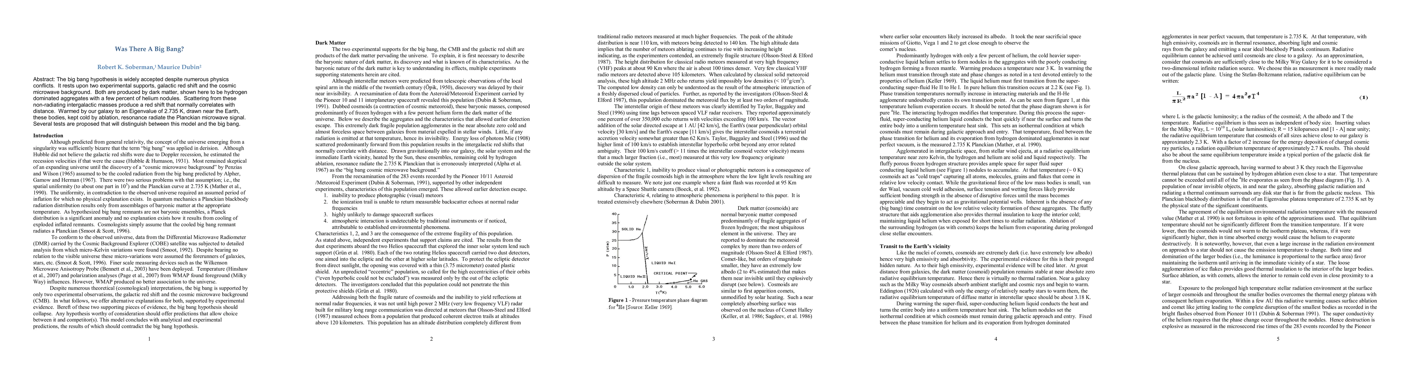 The paper challenges the big bang hypothesis, proposing that galactic red shift and cosmic microwave background are caused by hydrogen-dominated dark matter aggregates rather than an actual big bang. Tests are suggested to differentiate between this new model and the traditional big bang theory.