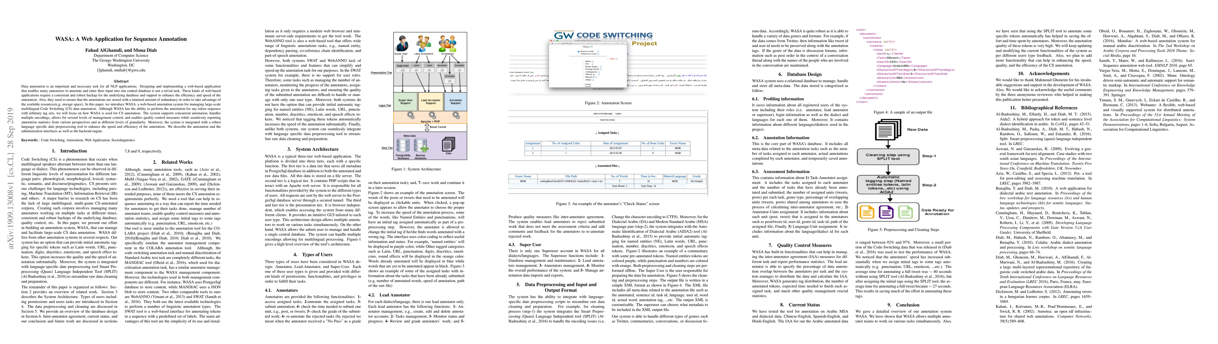 WASA is a web-based annotation system designed for managing large-scale multilingual Code Switching data annotation, supporting concurrent annotation, multiple encodings, and quality control measures. It integrates with a robust language preprocessing tool to enhance efficiency and provides detailed annotation statistics.