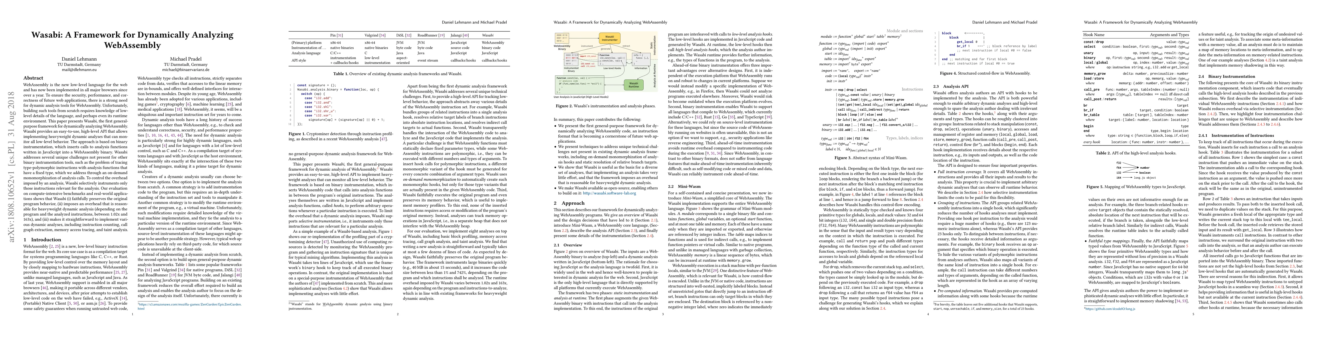 Wasabi is a framework for dynamically analyzing WebAssembly, providing a high-level API for implementing heavyweight dynamic analyses through binary instrumentation. It selectively instruments relevant instructions to control overhead, demonstrating reasonable performance impact and ease of implementing various analyses.