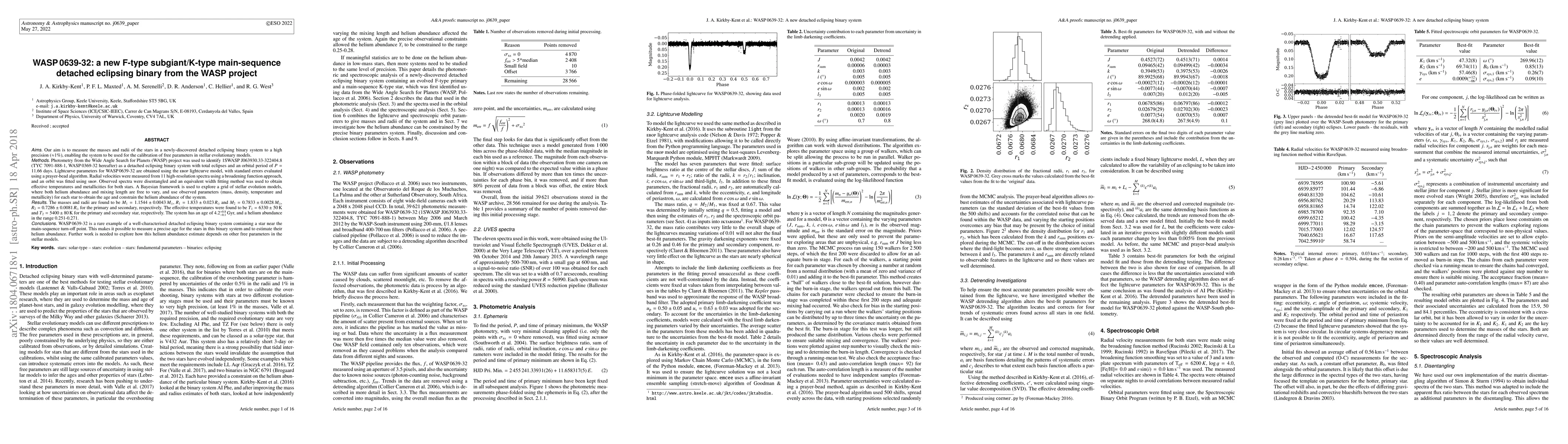 Abridged. Our aim is to measure the masses and radii of the stars in a newly-discovered detached eclipsing binary system to a high precision ($\approx$1%), enabling the system to be used for the calibration of free parameters in stellar evolutionary models. Photometry from the Wide Angle Search for Planets (WASP) project was used to identify 1SWASP J063930.33-322404.8 (TYC 7091-888-1, WASP 0369-32 hereafter) as a detached eclipsing binary system with total eclipses and an orbital period of P=11.66 days. Lightcurve parameters for WASP 0639-32 are obtained using the ebop lightcurve model, with standard errors evaluated using a prayer-bead algorithm. Radial velocities were measured from 11 high-resolution spectra using a broadening function approach, and an orbit was fitted using sbop. Observed spectra were disentangled and an equivalent width fitting method was used to obtain effective temperatures and metallicities for both stars. A Bayesian framework is used to explore a grid of stellar evolution models, where both helium abundance and mixing length are free to vary, and use observed parameters (mass, density, temperature and metallicity) for each star to obtain the age and constrain the helium abundance of the system. The masses and radii are found to be $M_{1}=1.1544\pm0.0043\,M_{\odot}$, $R_{1}=1.833\pm0.023\,R_{\odot}$ and $M_{2}=0.7833\pm0.0028\,M_{\odot}$, $R_{2}=0.7286\pm0.0081\,R_{\odot}$ for the primary and secondary, respectively. The effective temperatures were found to be $T_{1}=6330\pm50$ K and $T_{2}=5400\pm80$ K for the primary and secondary star, respectively. The system has an age of $4.2^{+0.8}_{-0.1}$ Gyr, and a helium abundance in the range 0.251-0.271. WASP 0639-32 is a rare example of a well-characterised detached eclipsing binary system containing a star near the main-sequence turn-off point. This make it possible to measure a precise age for the stars ...