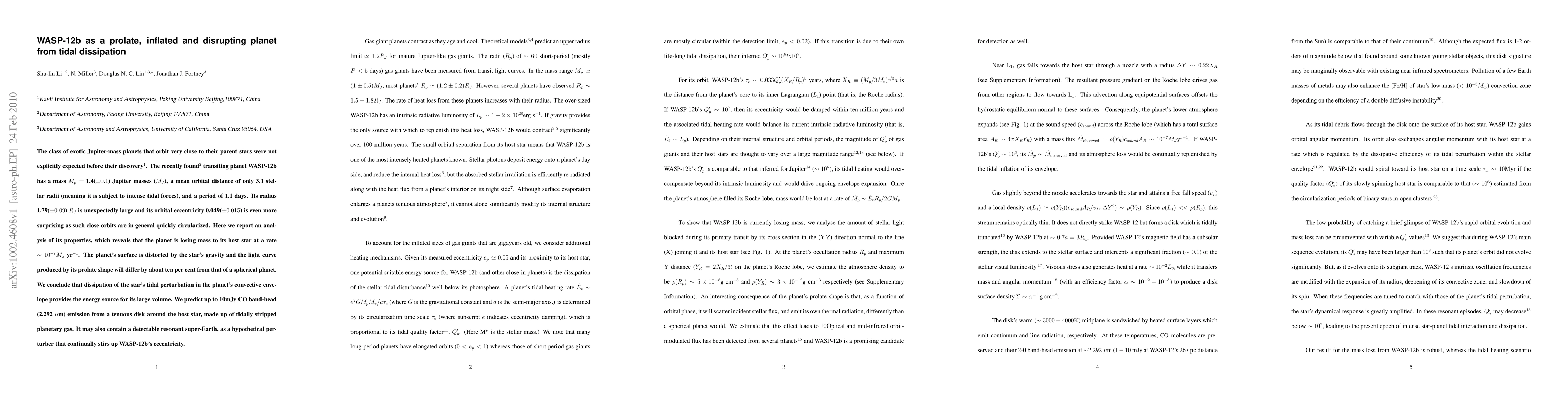 The research paper analyzes WASP-12b, a Jupiter-mass planet orbiting extremely close to its star, revealing it's losing mass, distorted into a prolate shape, and surrounded by a tenuous disk of stripped gas. This disk may harbor a detectable super-Earth.
