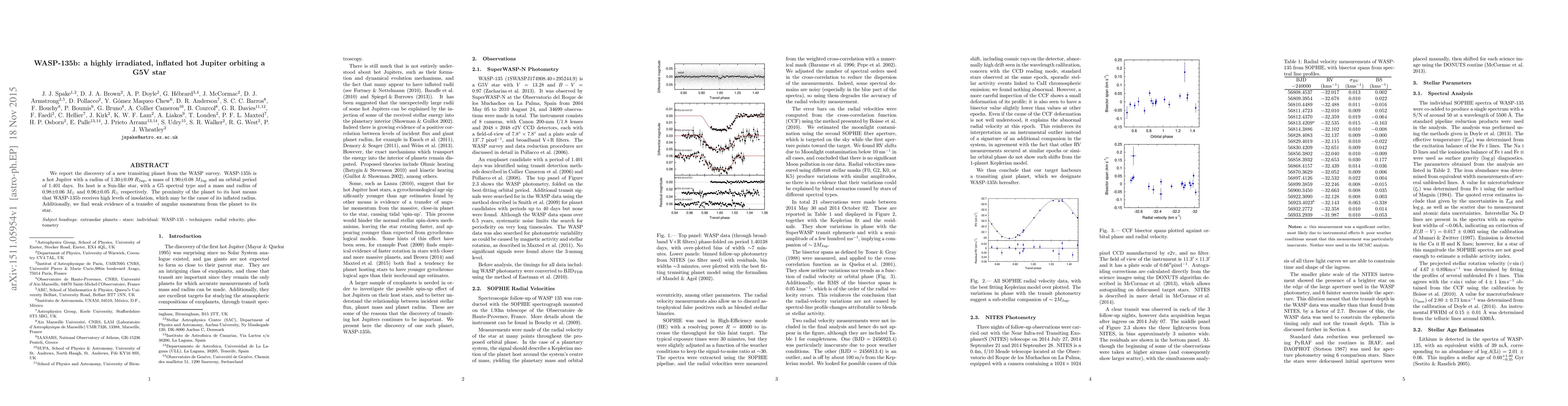 Summary: WASP-135b, a newly discovered hot Jupiter with an inflated radius, orbits a G5V star, receiving high insolation likely responsible for its inflated size. Weak evidence suggests a transfer of angular momentum from the planet to its star.