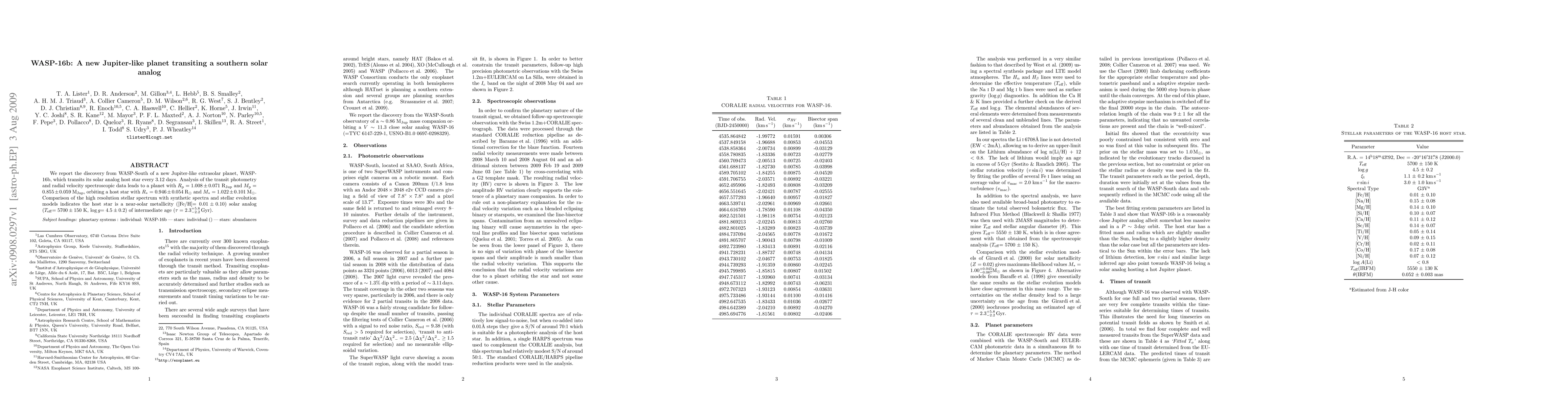 WASP-16b, a Jupiter-like exoplanet discovered by WASP-South, transits a solar analog host star every 3.12 days, with a radius and mass close to Jupiter's. The host star is a near-solar metallicity solar analog of intermediate age.