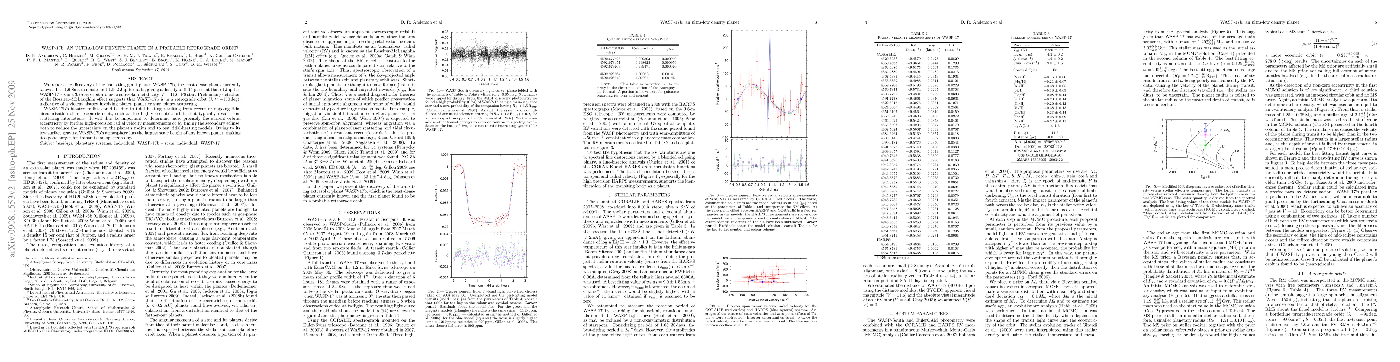 WASP-17b is an ultra-low density planet with a density 6-14% that of Jupiter, discovered in a probable retrograde orbit around an F6 star. Its bloated radius suggests tidal heating from recent orbital circularization.