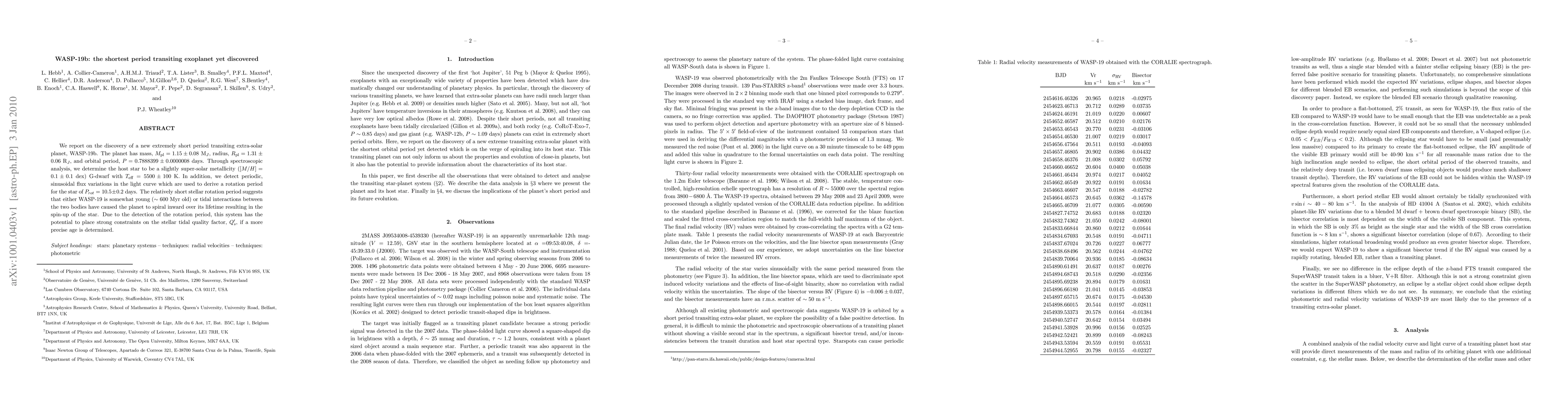 WASP-19b is a newly discovered transiting exoplanet with an extremely short orbital period of 0.7888 days, making it the shortest period transiting planet known. The host star exhibits a slightly super-solar metallicity and a relatively short rotation period, suggesting either youth or tidal interactions with the planet.