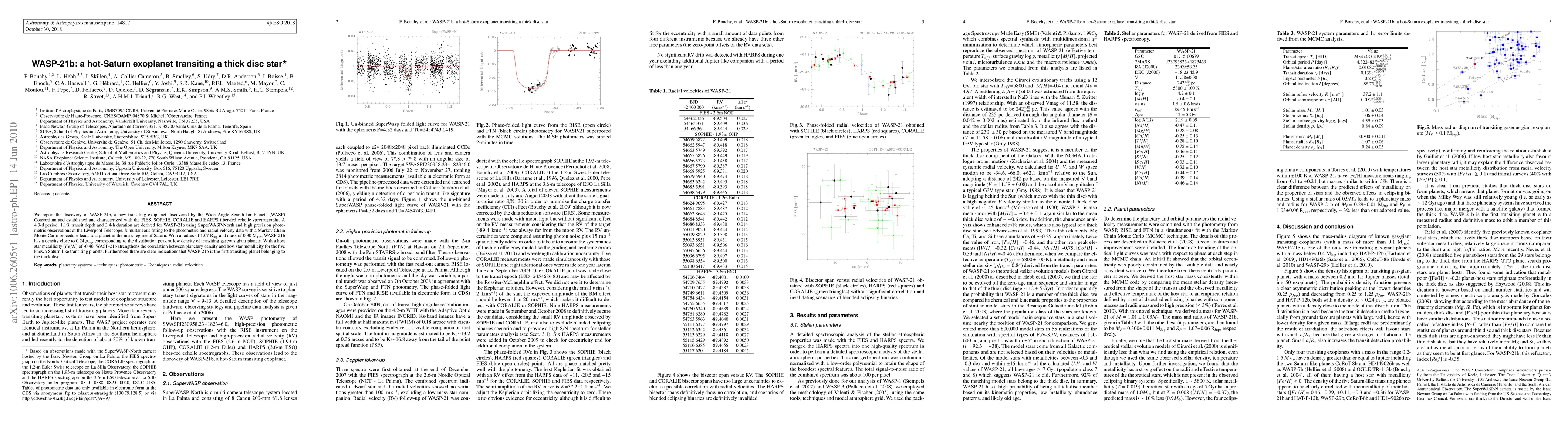 WASP-21b, a hot-Saturn exoplanet with a 4.3-day period, was discovered by the WASP Consortium and characterized using multiple spectrographs. It exhibits a low density, suggesting it belongs to the low-density peak of transiting gaseous giants, and is the first known planet from the thick disc of the Milky Way.