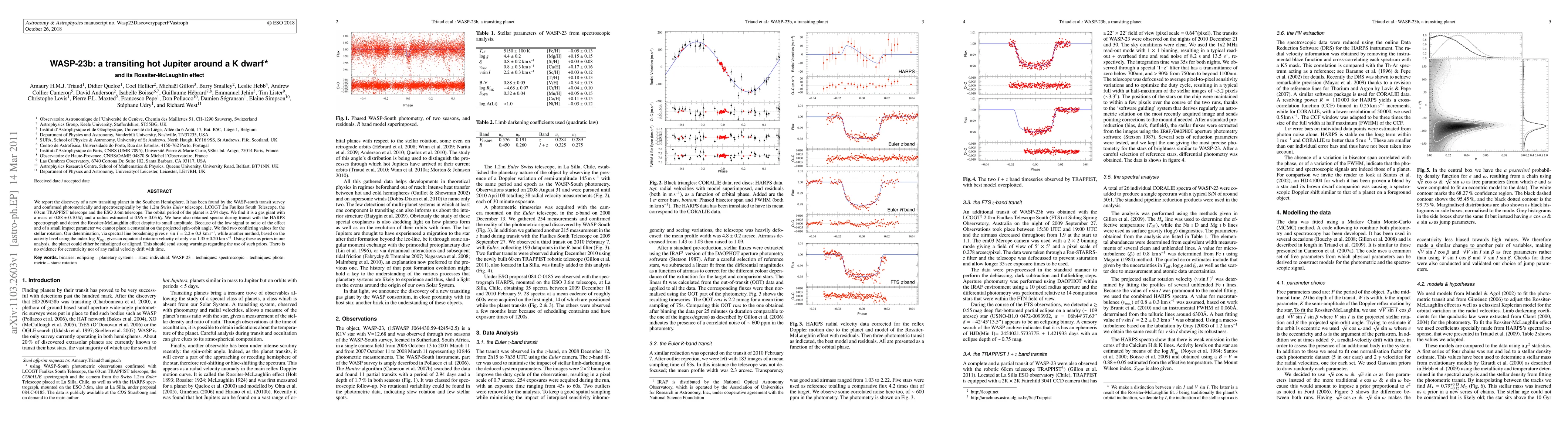 We report the discovery of a new transiting planet in the Southern Hemisphere. It has been found by the WASP-south transit survey and confirmed photometrically and spectroscopically by the 1.2m Swiss Euler telescope, LCOGT 2m Faulkes South Telescope, the 60 cm TRAPPIST telescope and the ESO 3.6m telescope. The orbital period of the planet is 2.94 days. We find it is a gas giant with a mass of 0.88 \pm 0.10 Mj and a radius estimated at 0.96 \pm 0.05 Rj . We have also obtained spectra during transit with the HARPS spectrograph and detect the Rossiter-McLaughlin effect despite its small amplitude. Because of the low signal to noise of the effect and of a small impact parameter we cannot place a constraint on the projected spin-orbit angle. We find two confiicting values for the stellar rotation. Our determination, via spectral line broadening gives v sin I = 2.2 \pm 0.3 km/s, while another method, based on the activity level using the index log R'HK, gives an equatorial rotation velocity of only v = 1.35 \pm 0.20 km/s. Using these as priors in our analysis, the planet could either be misaligned or aligned. This should send strong warnings regarding the use of such priors. There is no evidence for eccentricity nor of any radial velocity drift with time.