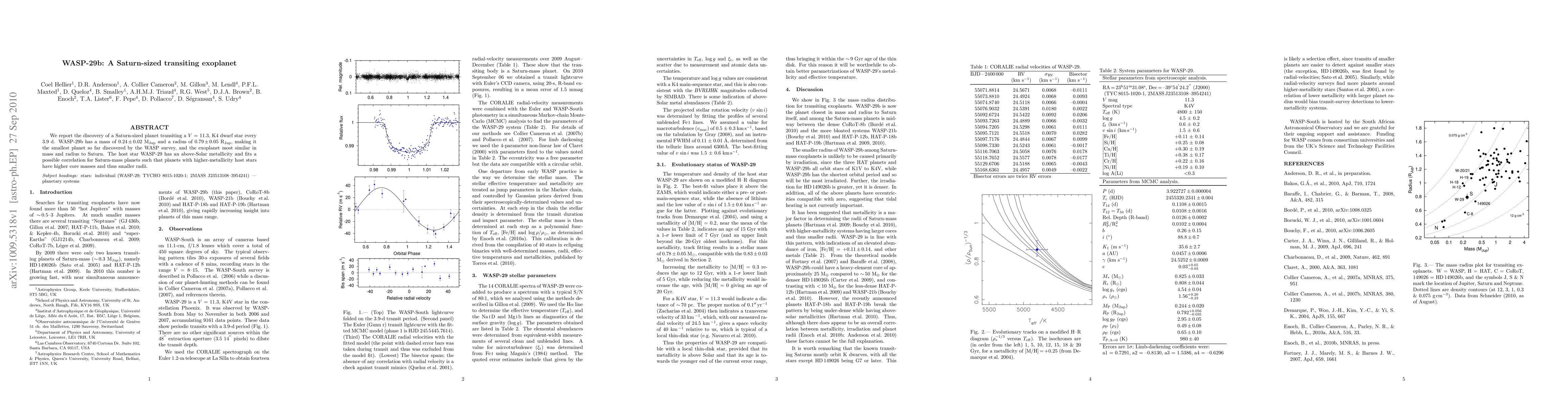 Summary: WASP-29b, a Saturn-sized exoplanet with a mass of 0.24 M_Jup and radius of 0.79 R_Jup, transits a K4 dwarf star every 3.9 days, making it the smallest planet discovered by the WASP survey and the most similar to Saturn in size and mass. The host star's high metallicity suggests a correlation between higher core mass and smaller planetary radii.