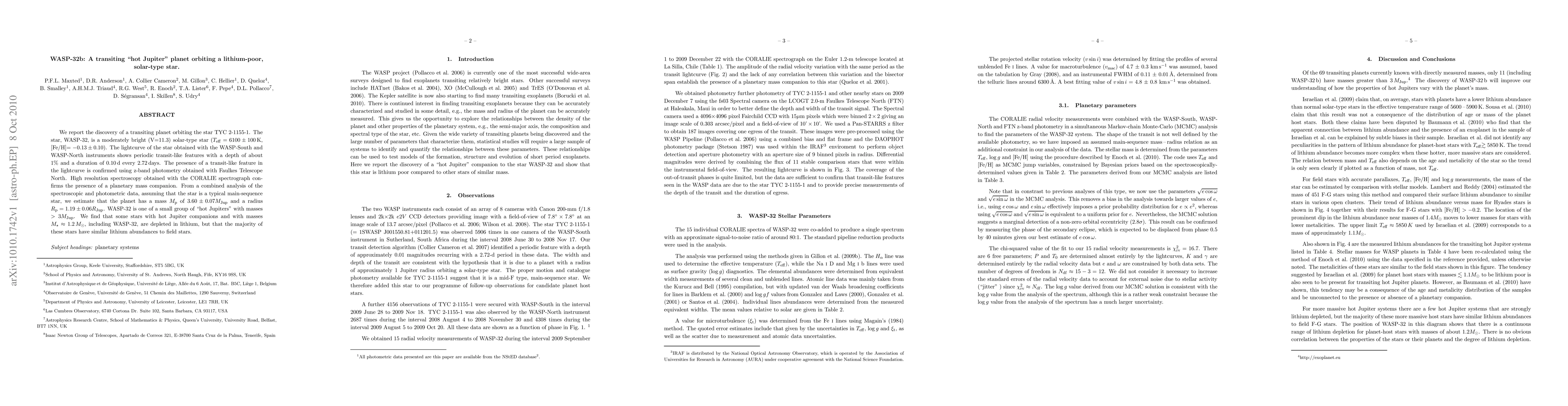 The paper reports the discovery of WASP-32b, a transiting hot Jupiter with a mass of 3.6 M_Jup and radius of 1.19 R_Jup orbiting the lithium-poor, solar-type star WASP-32. This star exhibits periodic transit-like features confirmed by multiple instruments and spectroscopic data.