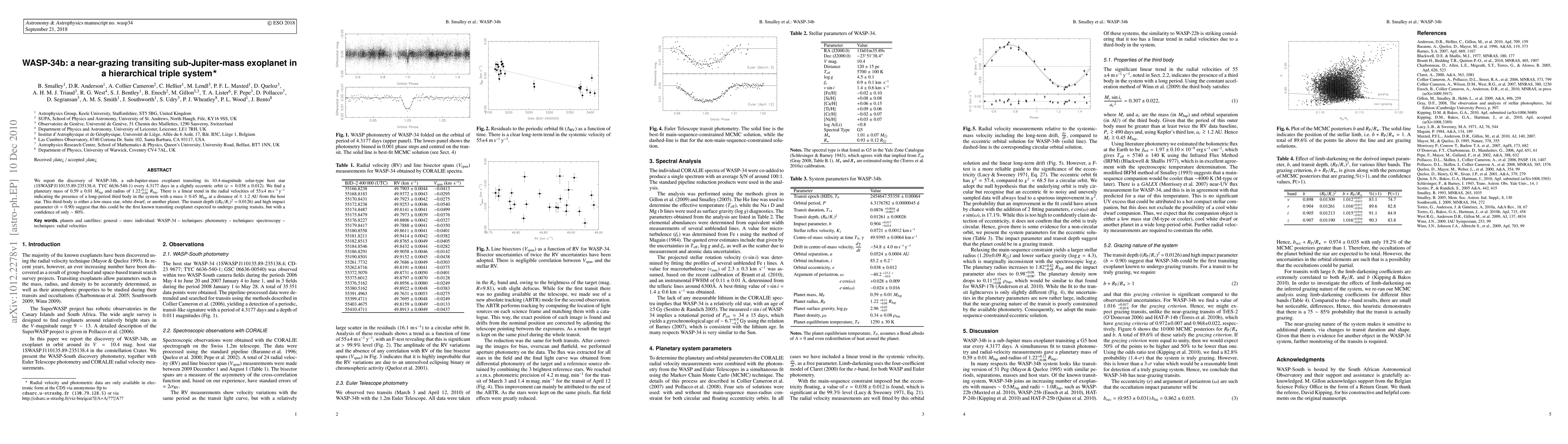 WASP-34b is a sub-Jupiter-mass exoplanet transiting its host star in a slightly eccentric orbit, with a potential third body influencing the system. The exoplanet exhibits a high impact parameter, suggesting it may undergo grazing transits.