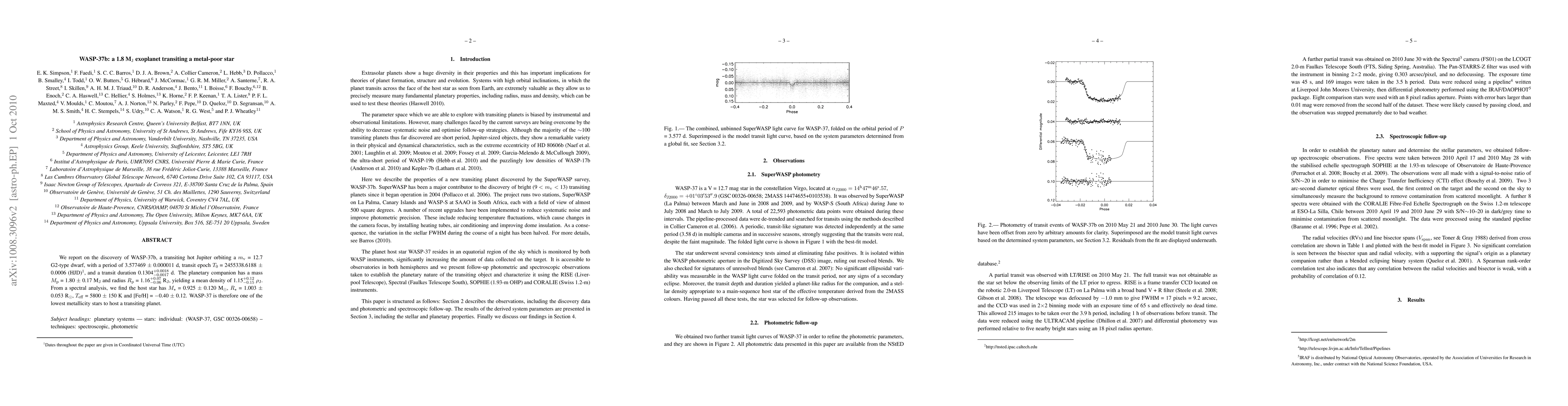 WASP-37b is a 1.8 MJ hot Jupiter transiting a metal-poor G2-type star, with a low metallicity of [Fe/H] = -0.40, making it one of the lowest metallicity stars known to host a transiting planet. The planet has a radius of 1.16 RJ and orbits its host star every 3.58 days.