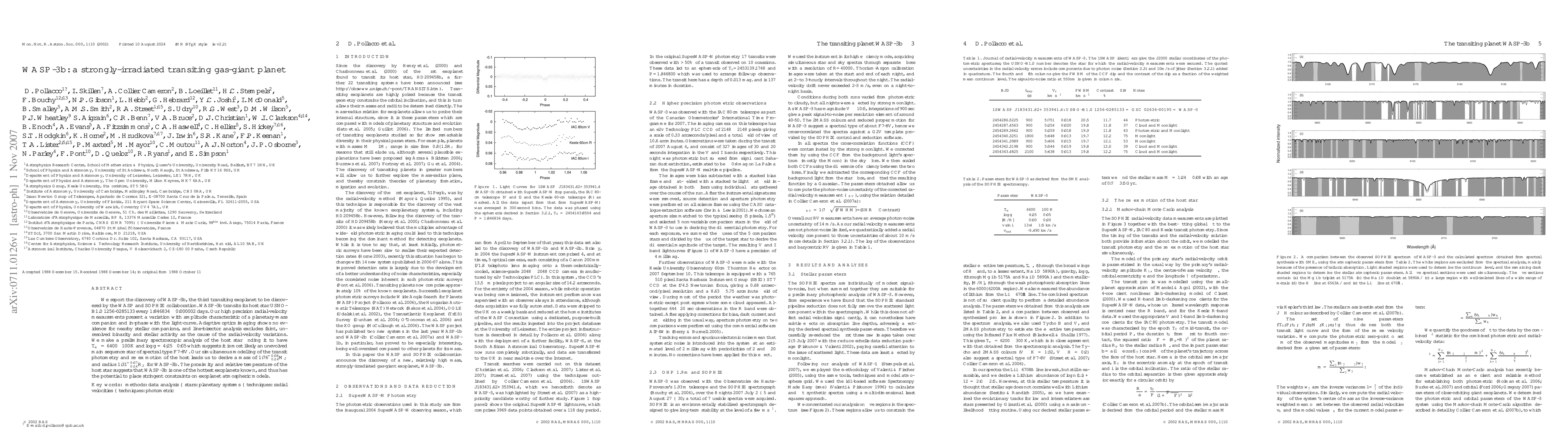 WASP-3b, discovered by the WASP and SOPHIE collaboration, is a transiting gas-giant exoplanet orbiting its host star every 1.846834 days. It is one of the hottest known exoplanets, with a mass and radius of 1.76 M_J and 1.31 R_J, respectively, and provides valuable data for atmospheric models.