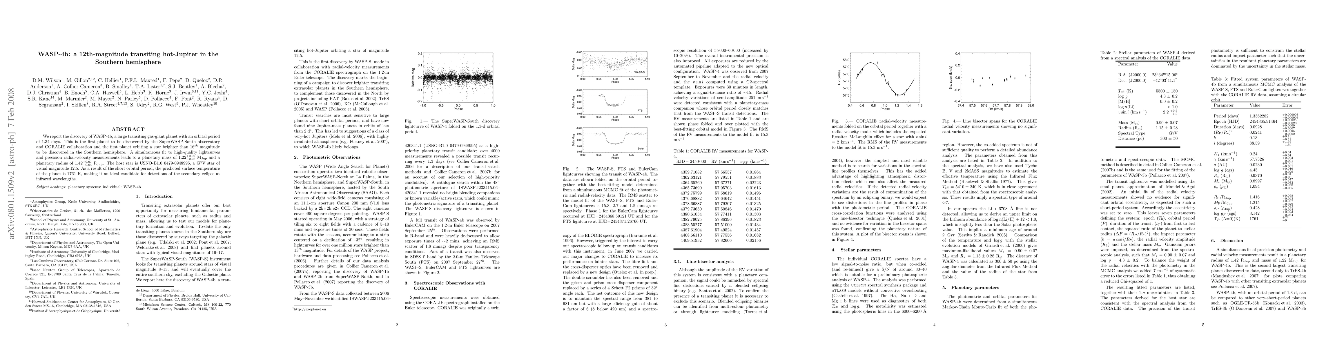 WASP-4b, a transiting hot-Jupiter with a 1.34-day orbital period, was discovered by the SuperWASP-South observatory and CORALIE collaboration. It orbits a G7V star, USNO-B1.0 0479-0948995, and has a mass of 1.22 +/- 0.1 MJup and a radius of 1.42 +/- 0.08 RJup, making it an ideal candidate for infrared secondary eclipse detections.