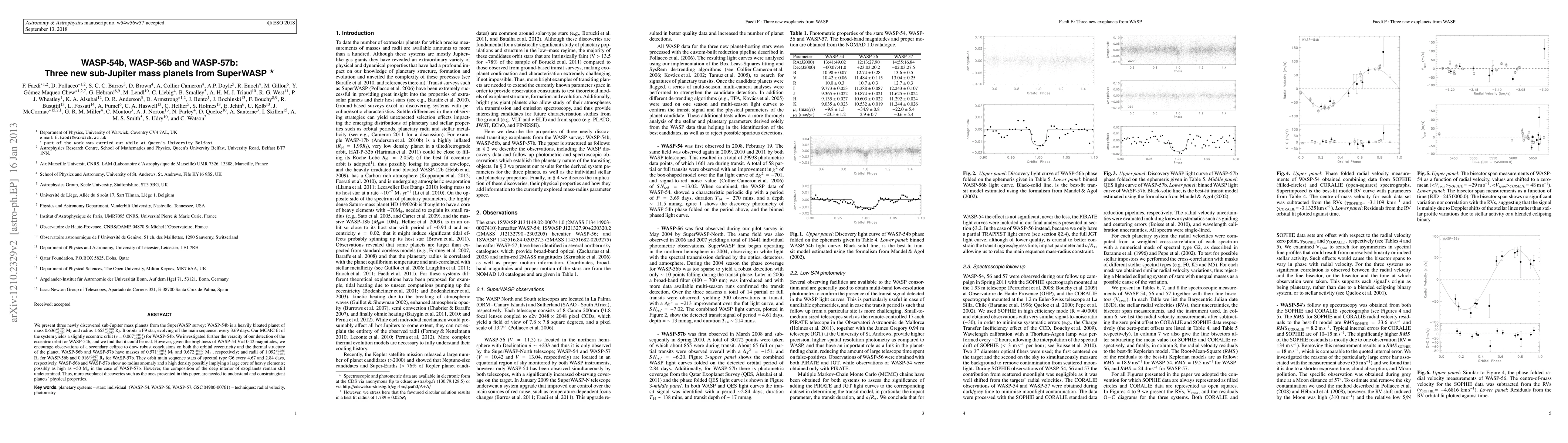 The SuperWASP survey discovered three new sub-Jupiter mass planets: WASP-54b, a bloated planet with a slightly eccentric orbit around an evolving F9 star; and WASP-56b and WASP-57b, denser planets orbiting G6 main sequence stars, potentially indicating large cores of heavy elements.