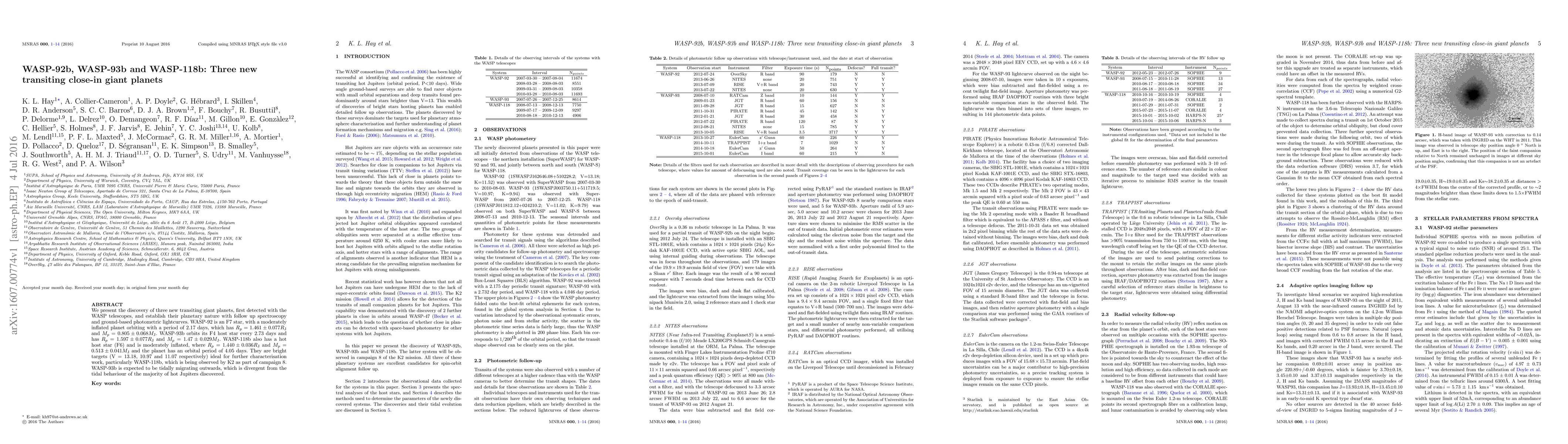 We present the discovery of three new transiting giant planets, first detected with the WASP telescopes, and establish their planetary nature with follow up spectroscopy and ground-based photometric lightcurves. WASP-92 is an F7 star, with a moderately inflated planet orbiting with a period of 2.17 days, which has $R_p = 1.461 \pm 0.077 R_{\rm J}$ and $M_p = 0.805 \pm 0.068 M_{\rm J}$. WASP-93b orbits its F4 host star every 2.73 days and has $R_p = 1.597 \pm 0.077 R_{\rm J}$ and $M_p = 1.47 \pm 0.029 M_{\rm J}$. WASP-118b also has a hot host star (F6) and is moderately inflated, where $R_p = 1.440 \pm 0.036 R_{\rm J}$ and $M_p = 0.513 \pm 0.041 M_{\rm J}$ and the planet has an orbital period of 4.05 days. They are bright targets (V = 13.18, 10.97 and 11.07 respectively) ideal for further characterisation work, particularly WASP-118b, which is being observed by K2 as part of campaign 8. WASP-93b is expected to be tidally migrating outwards, which is divergent from the tidal behaviour of the majority of hot Jupiters discovered.