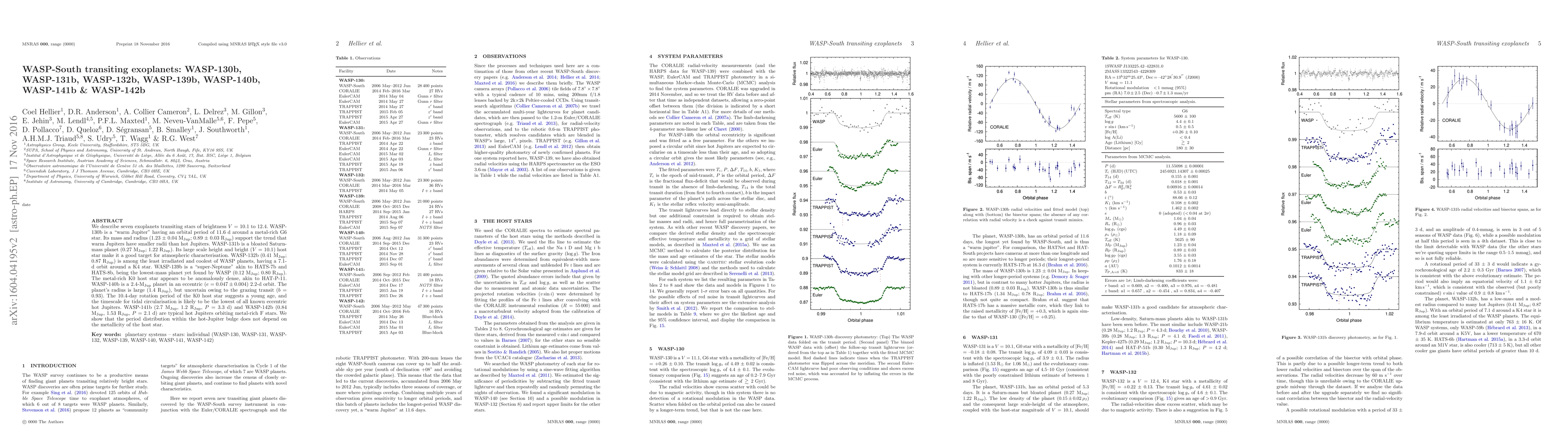 We describe seven exoplanets transiting stars of brightness V = 10.1 to 12.4. WASP-130b is a "warm Jupiter" having an orbital period of 11.6 d around a metal-rich G6 star. Its mass and radius (1.23 +/- 0.04 Mjup; 0.89 +/- 0.03 Rjup) support the trend that warm Jupiters have smaller radii than hot Jupiters. WASP-131b is a bloated Saturn-mass planet (0.27 Mjup; 1.22 Rjup). Its large scale height and bright (V = 10.1) host star make it a good target for atmospheric characterisation. WASP-132b (0.41 Mjup; 0.87 Rjup) is among the least irradiated and coolest of WASP planets, having a 7.1-d orbit around a K4 star. WASP-139b is a "super-Neptune" akin to HATS-7b and HATS-8b, being the lowest-mass planet yet found by WASP (0.12 Mjup; 0.80 Rjup). The metal-rich K0 host star appears to be anomalously dense, akin to HAT-P-11. WASP-140b is a 2.4-Mjup planet in an eccentric (e = 0.047 +/- 0.004) 2.2-d orbit. The planet's radius is large (1.4 Rjup), but uncertain owing to the grazing transit (b = 0.93). The 10.4-day rotation period of the K0 host star suggests a young age, and the timescale for tidal circularisation is likely to be the lowest of all known eccentric hot Jupiters. WASP-141b (2.7 Mjup, 1.2 Rjup, P = 3.3 d) and WASP-142b (0.84 Mjup, 1.53 Rjup, P = 2.1 d) are typical hot Jupiters orbiting metal-rich F stars. We show that the period distribution within the hot-Jupiter bulge does not depend on the metallicity of the host star.