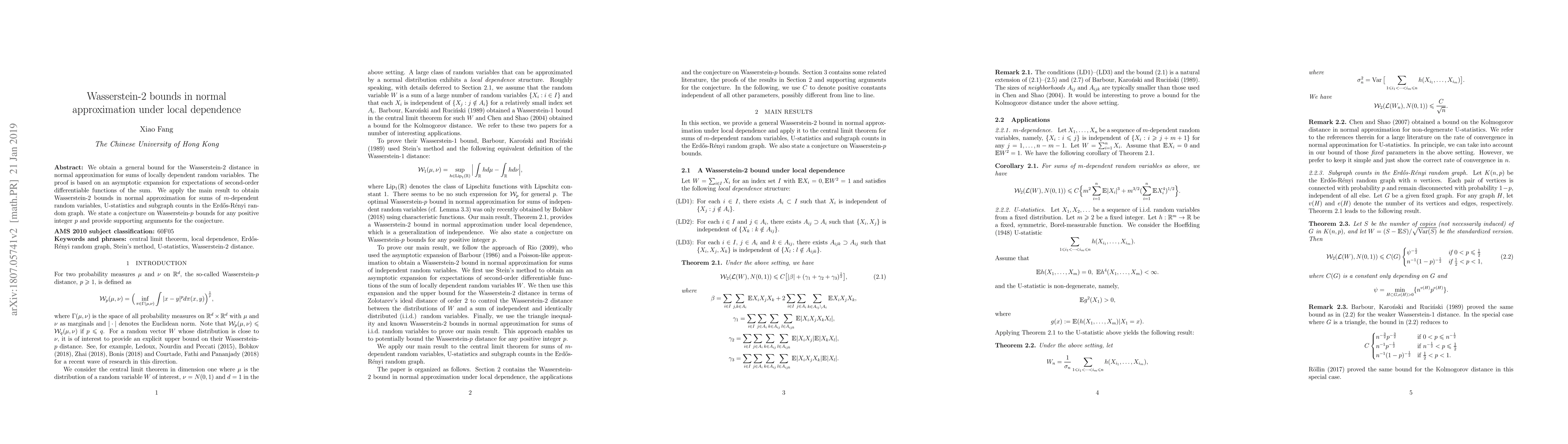 This paper presents a general bound for the Wasserstein-2 distance in normal approximation for sums of locally dependent random variables, utilizing an asymptotic expansion for second-order differentiable functions. It applies these results to $m$-dependent random variables, U-statistics, and subgraph counts in the Erdős-Rényi random graph, and proposes a conjecture for Wasserstein-$p$ bounds.