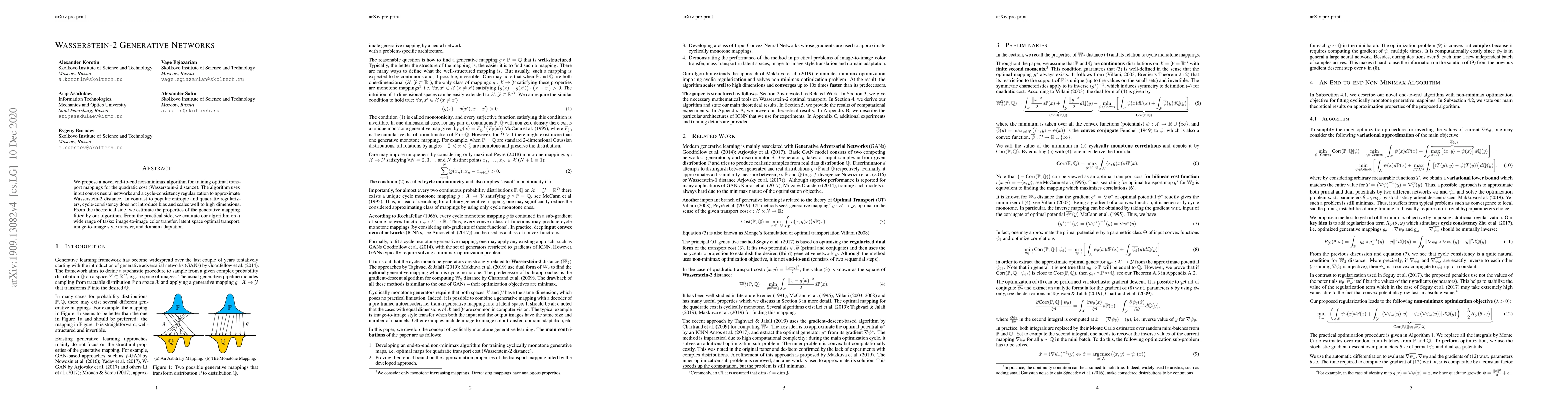 This paper proposes a new algorithm for training generative networks that can map between different data distributions using the Wasserstein-2 distance. It achieves state-of-the-art results in various image processing tasks such as color transfer, style transfer, and domain adaptation.