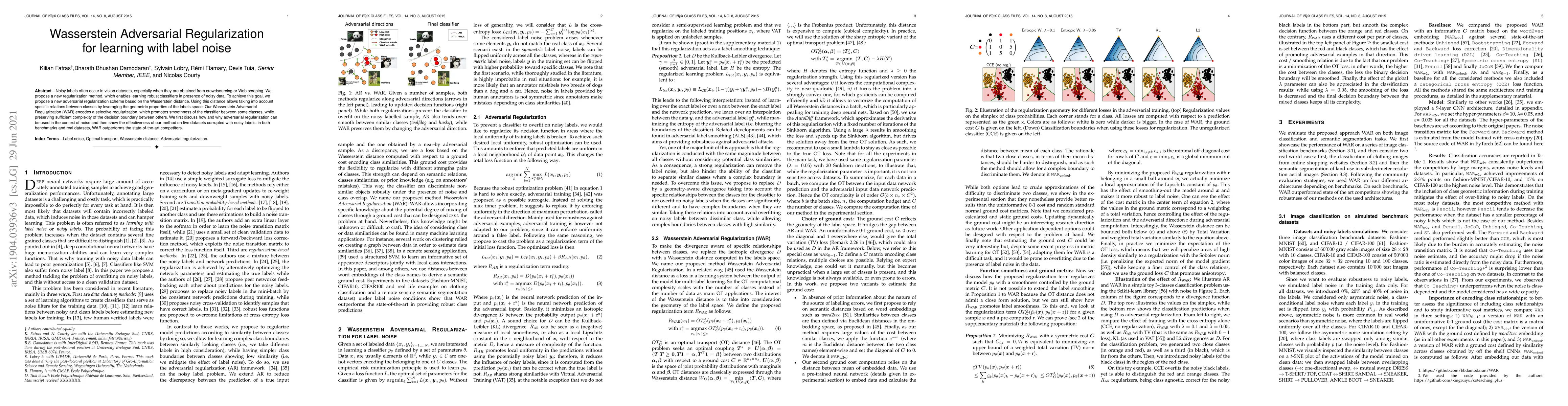 The paper proposes Wasserstein Adversarial Regularization (WAR) to improve classifier robustness against label noise, leveraging the Wasserstein distance to selectively smooth decision boundaries between certain classes while maintaining complexity for others. WAR outperforms state-of-the-art methods on five datasets with noisy labels.