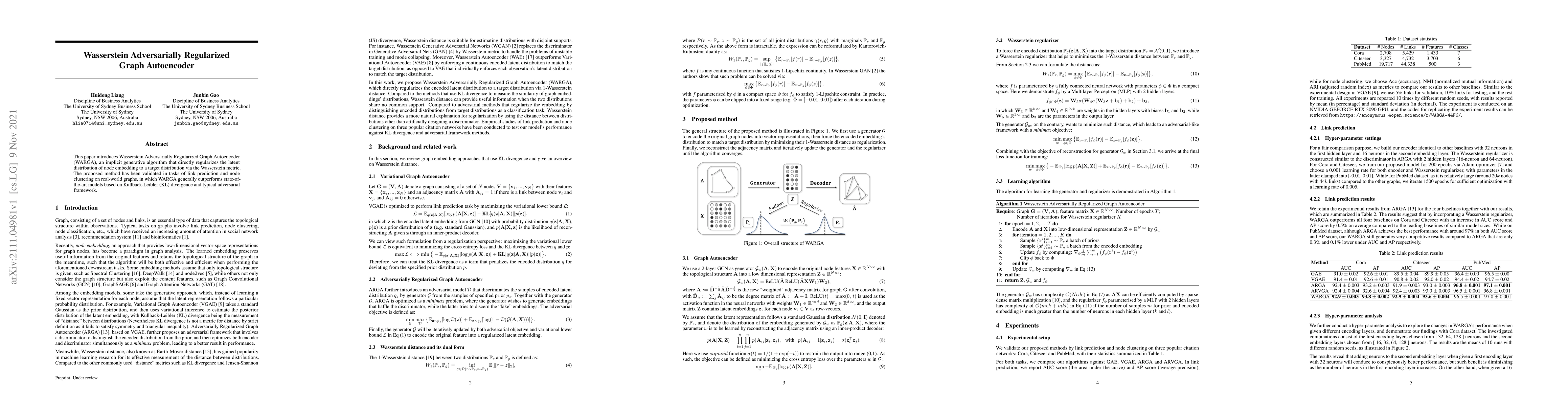 This paper proposes WARGA, a generative graph autoencoder that regularizes node embeddings using the Wasserstein metric, showing superior performance in link prediction and node clustering compared to models using KL divergence and standard adversarial methods.