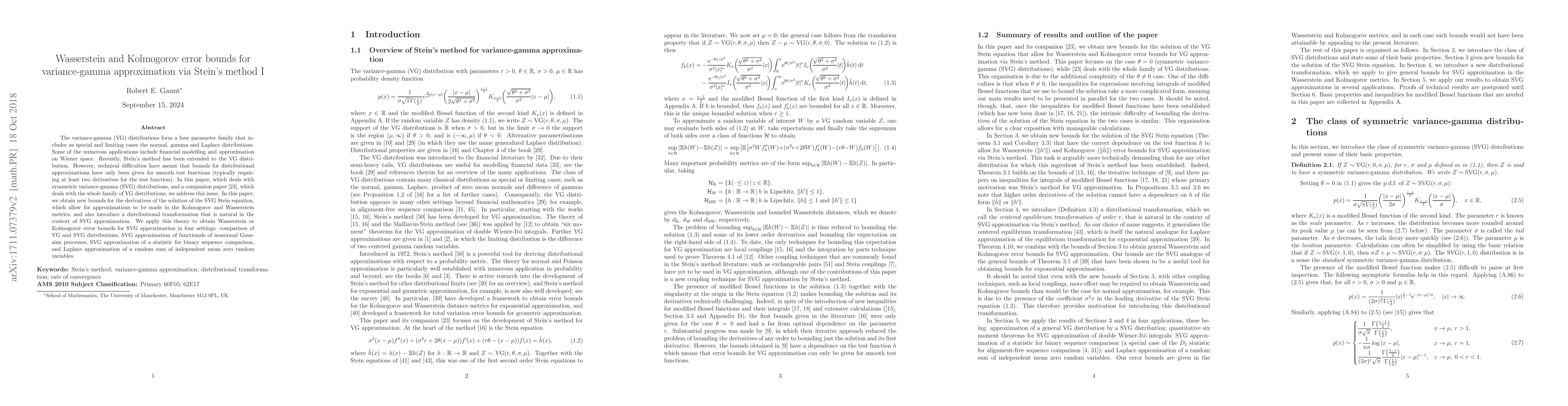 The variance-gamma (VG) distributions form a four parameter family that includes as special and limiting cases the normal, gamma and Laplace distributions. Some of the numerous applications include financial modelling and approximation on Wiener space. Recently, Stein's method has been extended to the VG distribution. However, technical difficulties have meant that bounds for distributional approximations have only been given for smooth test functions (typically requiring at least two derivatives for the test function). In this paper, which deals with symmetric variance-gamma (SVG) distributions, and a companion paper \cite{gaunt vgii}, which deals with the whole family of VG distributions, we address this issue. In this paper, we obtain new bounds for the derivatives of the solution of the SVG Stein equation, which allow for approximations to be made in the Kolmogorov and Wasserstein metrics, and also introduce a distributional transformation that is natural in the context of SVG approximation. We apply this theory to obtain Wasserstein or Kolmogorov error bounds for SVG approximation in four settings: comparison of VG and SVG distributions, SVG approximation of functionals of isonormal Gaussian processes, SVG approximation of a statistic for binary sequence comparison, and Laplace approximation of a random sum of independent mean zero random variables.