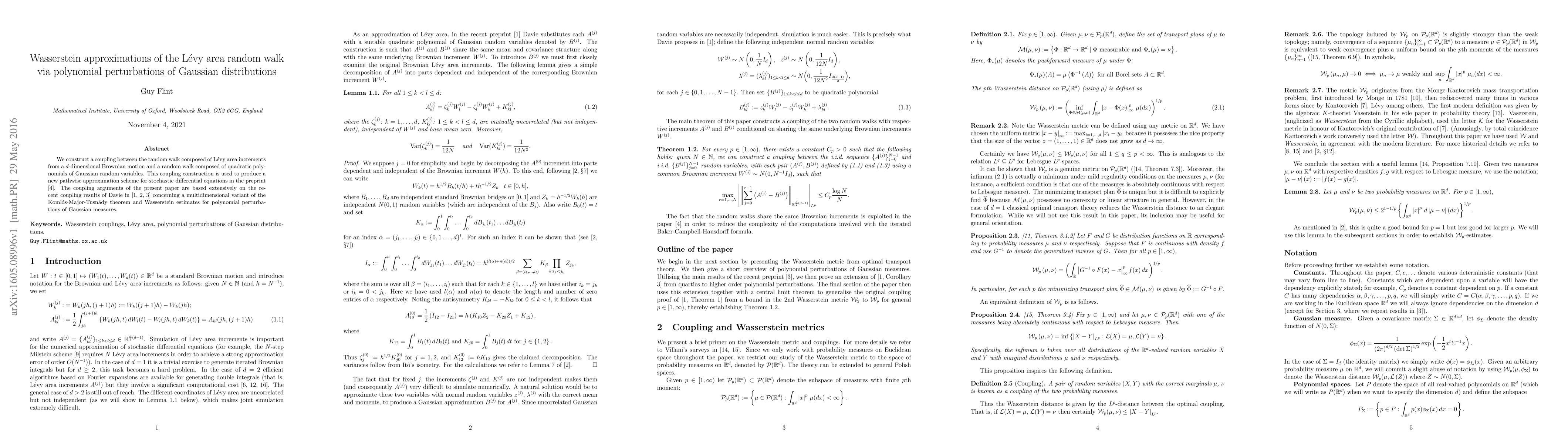 We construct a coupling between the random walk composed of L\'evy area increments from a $d$-dimensional Brownian motion and a random walk composed of quadratic polynomials of Gaussian random variables. This coupling construction is used to produce a new pathwise approximation scheme for stochastic differential equations in the preprint [Flint-Lyons-2015]. The coupling arguments of the present paper are based extensively on the recent coupling results of Davie concerning a multidimensional variant of the Koml\'os-Major-Tusn\'ady theorem and Wasserstein estimates for polynomial perturbations of Gaussian measures.