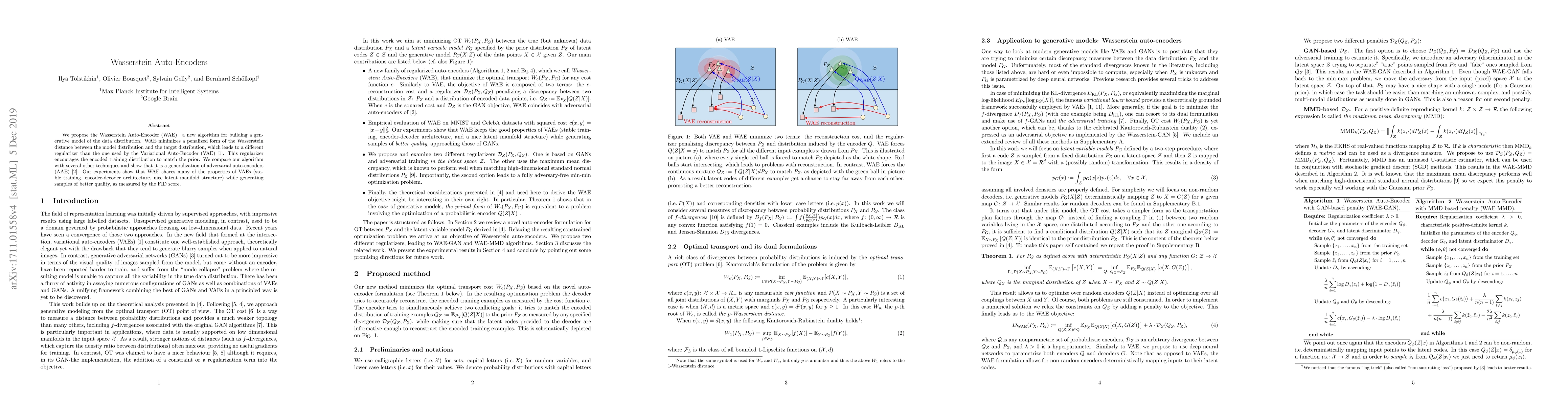 We propose the Wasserstein Auto-Encoder (WAE)---a new algorithm for building a generative model of the data distribution. WAE minimizes a penalized form of the Wasserstein distance between the model distribution and the target distribution, which leads to a different regularizer than the one used by the Variational Auto-Encoder (VAE). This regularizer encourages the encoded training distribution to match the prior. We compare our algorithm with several other techniques and show that it is a generalization of adversarial auto-encoders (AAE). Our experiments show that WAE shares many of the properties of VAEs (stable training, encoder-decoder architecture, nice latent manifold structure) while generating samples of better quality, as measured by the FID score.