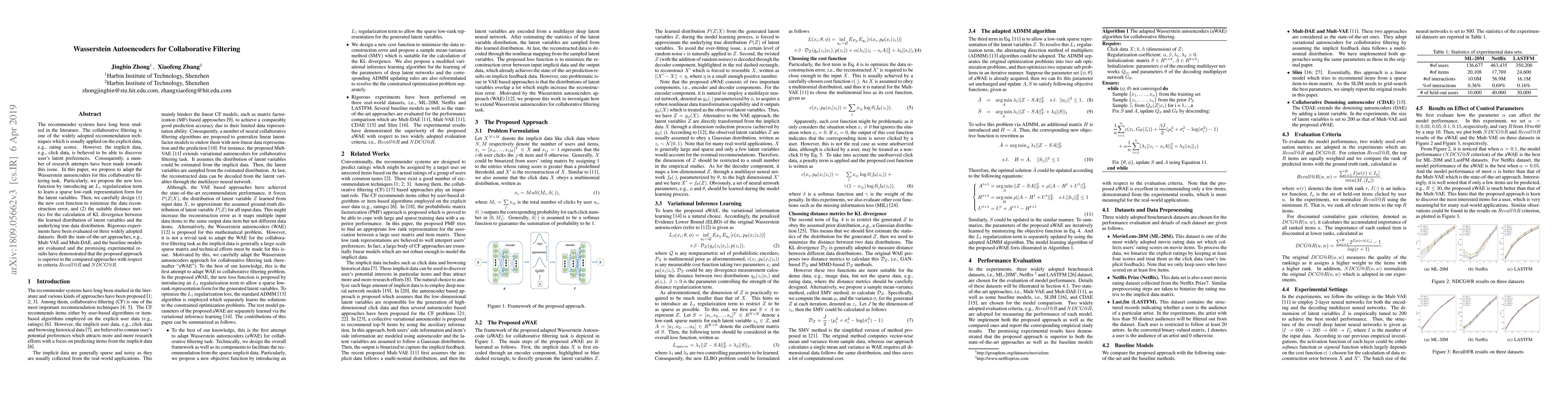 This paper proposes Wasserstein Autoencoders (WAE) for enhancing collaborative filtering using implicit user feedback. It introduces two additional loss terms to the WAE to improve latent variable distribution and sparsity, and evaluates the method on three datasets, outperforming baseline and state-of-the-art methods in Recall@1, Recall@5, and NDCG@10.