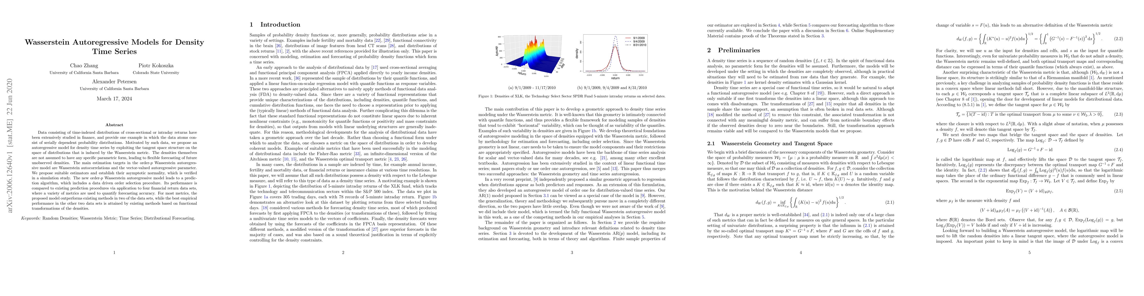 Data consisting of time-indexed distributions of cross-sectional or intraday returns have been extensively studied in finance, and provide one example in which the data atoms consist of serially dependent probability distributions. Motivated by such data, we propose an autoregressive model for density time series by exploiting the tangent space structure on the space of distributions that is induced by the Wasserstein metric. The densities themselves are not assumed to have any specific parametric form, leading to flexible forecasting of future unobserved densities. The main estimation targets in the order-$p$ Wasserstein autoregressive model are Wasserstein autocorrelations and the vector-valued autoregressive parameter. We propose suitable estimators and establish their asymptotic normality, which is verified in a simulation study. The new order-$p$ Wasserstein autoregressive model leads to a prediction algorithm, which includes a data driven order selection procedure. Its performance is compared to existing prediction procedures via application to four financial return data sets, where a variety of metrics are used to quantify forecasting accuracy. For most metrics, the proposed model outperforms existing methods in two of the data sets, while the best empirical performance in the other two data sets is attained by existing methods based on functional transformations of the densities.