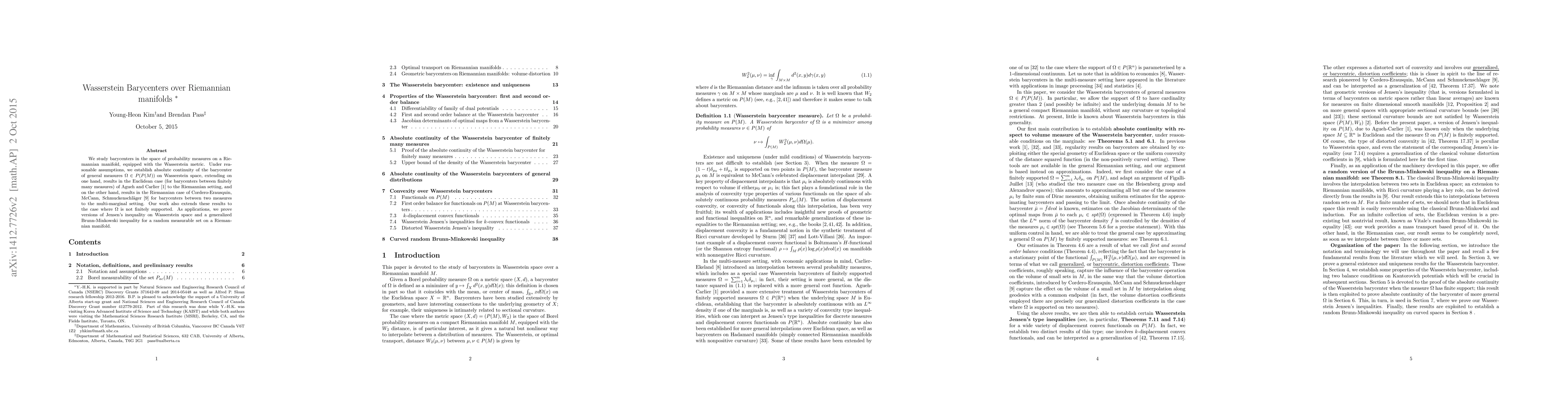 We study barycenters in the space of probability measures on a Riemannian manifold, equipped with the Wasserstein metric. Under reasonable assumptions, we establish absolute continuity of the barycenter of general measures $\Omega \in P(P(M))$ on Wasserstein space, extending on one hand, results in the Euclidean case (for barycenters between finitely many measures) of Agueh and Carlier \cite{ac} to the Riemannian setting, and on the other hand, results in the Riemannian case of Cordero-Erausquin, McCann, Schmuckenschl\"ager \cite{c-ems} for barycenters between two measures to the multi-marginal setting. Our work also extends these results to the case where $\Omega$ is not finitely supported. As applications, we prove versions of Jensen's inequality on Wasserstein space and a generalized Brunn-Minkowski inequality for a random measurable set on a Riemannian manifold.