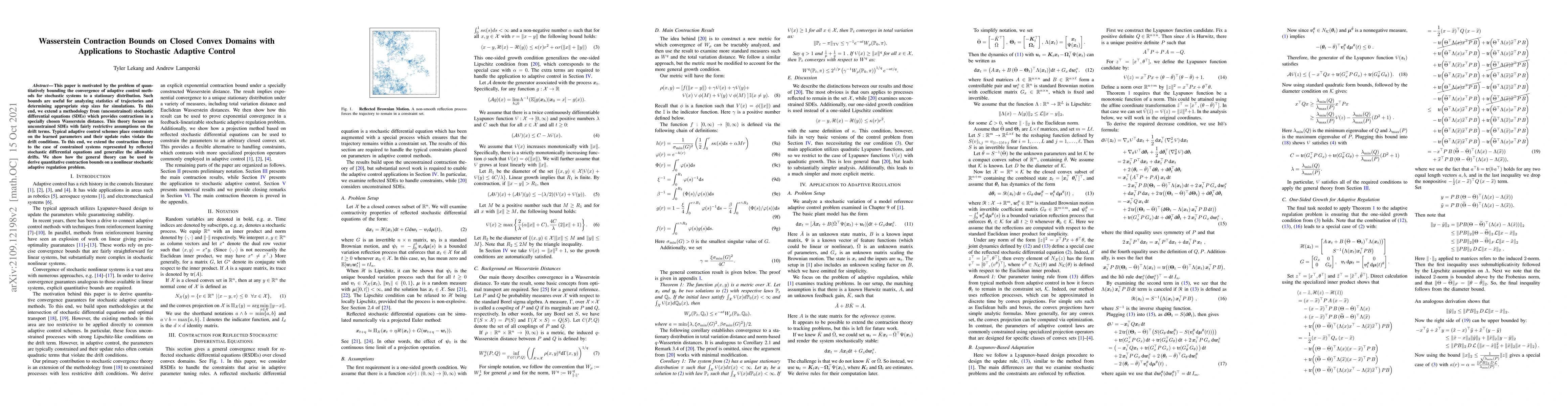This paper is motivated by the problem of quantitatively bounding the convergence of adaptive control methods for stochastic systems to a stationary distribution. Such bounds are useful for analyzing statistics of trajectories and determining appropriate step sizes for simulations. To this end, we extend a methodology from (unconstrained) stochastic differential equations (SDEs) which provides contractions in a specially chosen Wasserstein distance. This theory focuses on unconstrained SDEs with fairly restrictive assumptions on the drift terms. Typical adaptive control schemes place constraints on the learned parameters and their update rules violate the drift conditions. To this end, we extend the contraction theory to the case of constrained systems represented by reflected stochastic differential equations and generalize the allowable drifts. We show how the general theory can be used to derive quantitative contraction bounds on a nonlinear stochastic adaptive regulation problem.