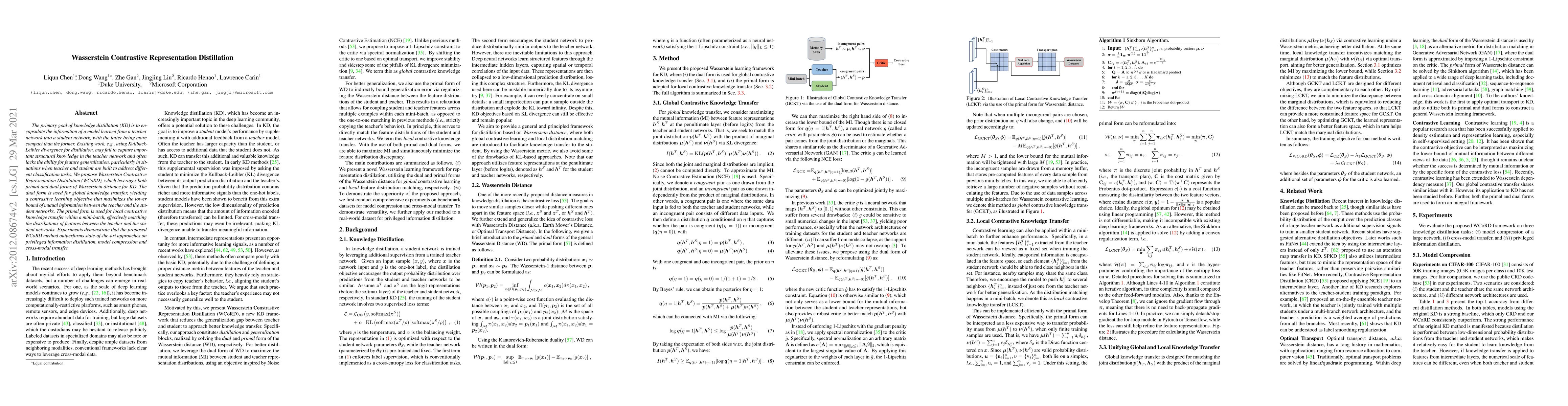 This paper introduces Wasserstein Contrastive Representation Distillation (WCoRD) for knowledge distillation. WCoRD uses Wasserstein distance in both primal and dual forms for global and local feature matching between teacher and student networks, respectively. It outperforms existing methods in tasks like model compression and cross-modal transfer.